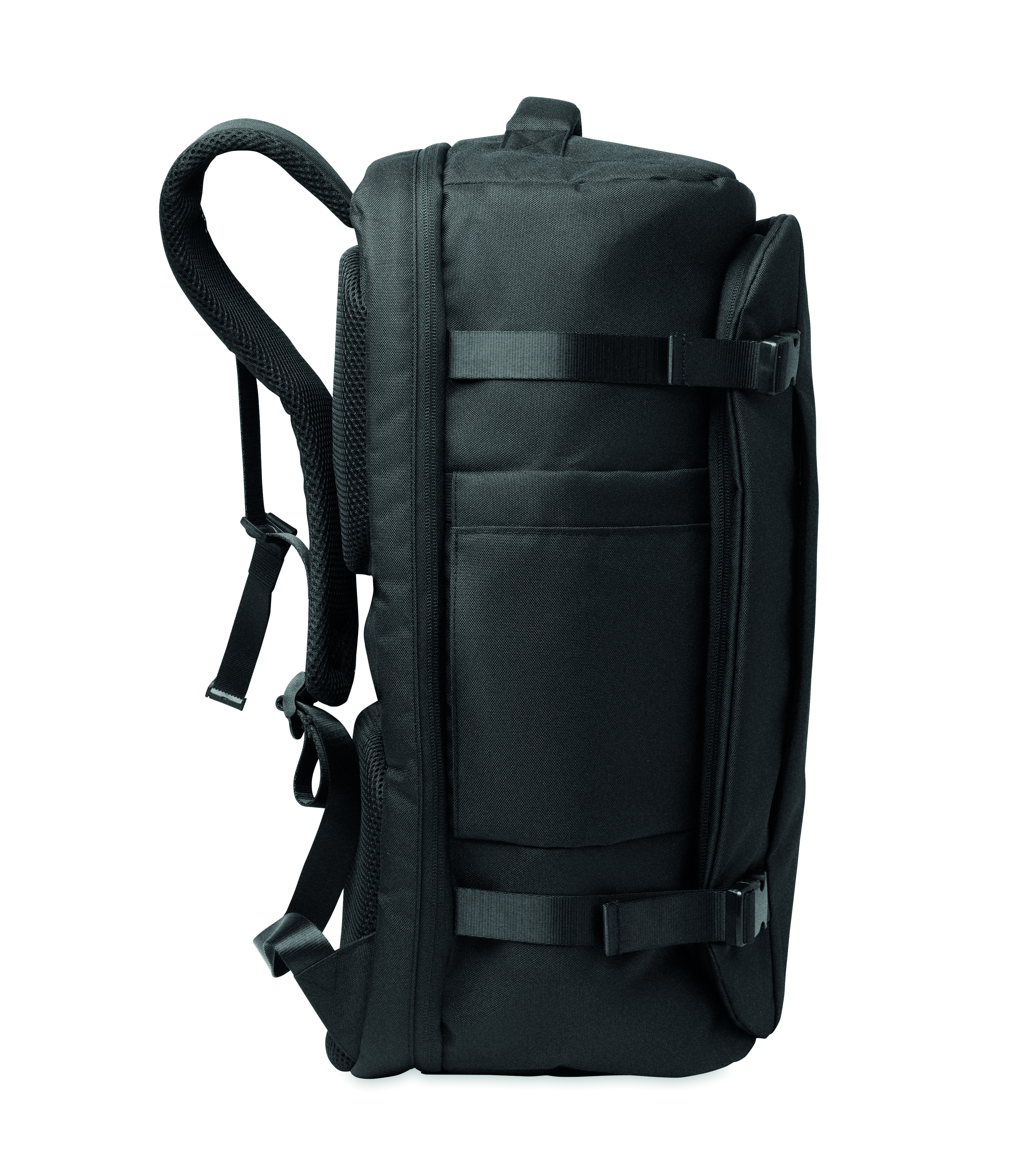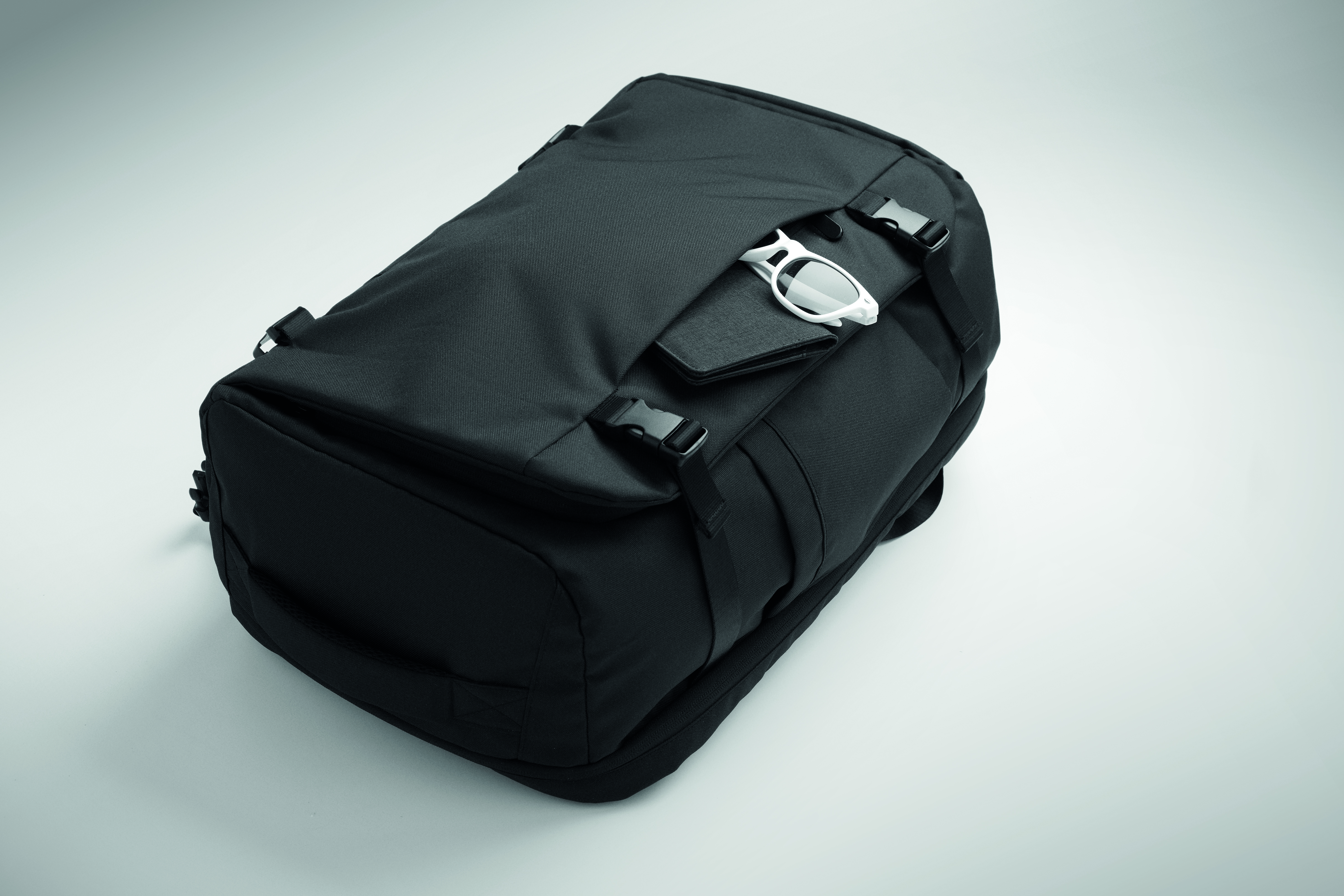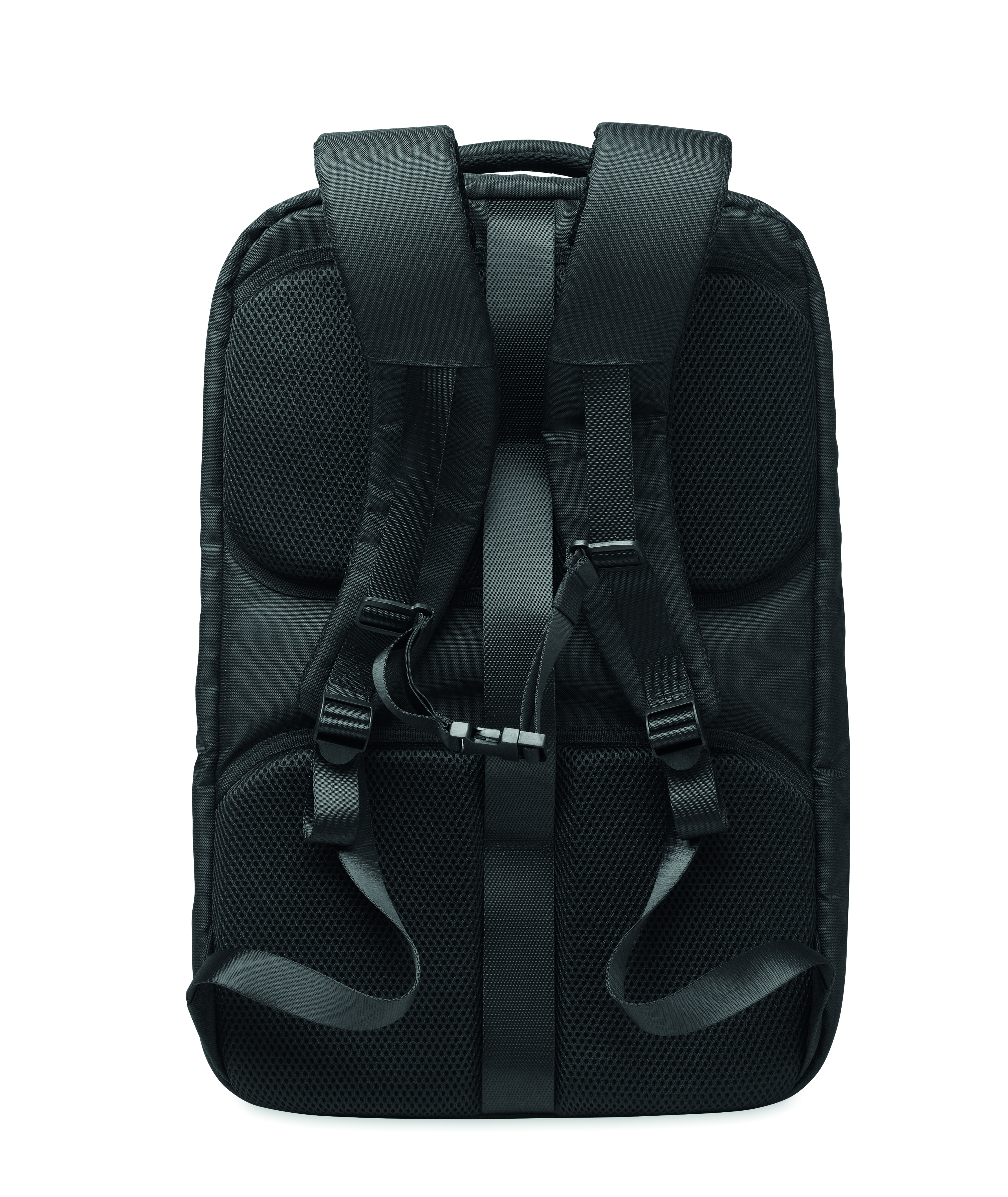 Großer 17'' Laptop-Reiserucksack aus 600D RPET-Polyester. Diverse Fächer mit Hauptfach für Kleidung, zwei gepolsterten Fächern für Laptop und Tablet und mehr. Gepolsterte Rückseite, Schultergurt und Tragegriff.