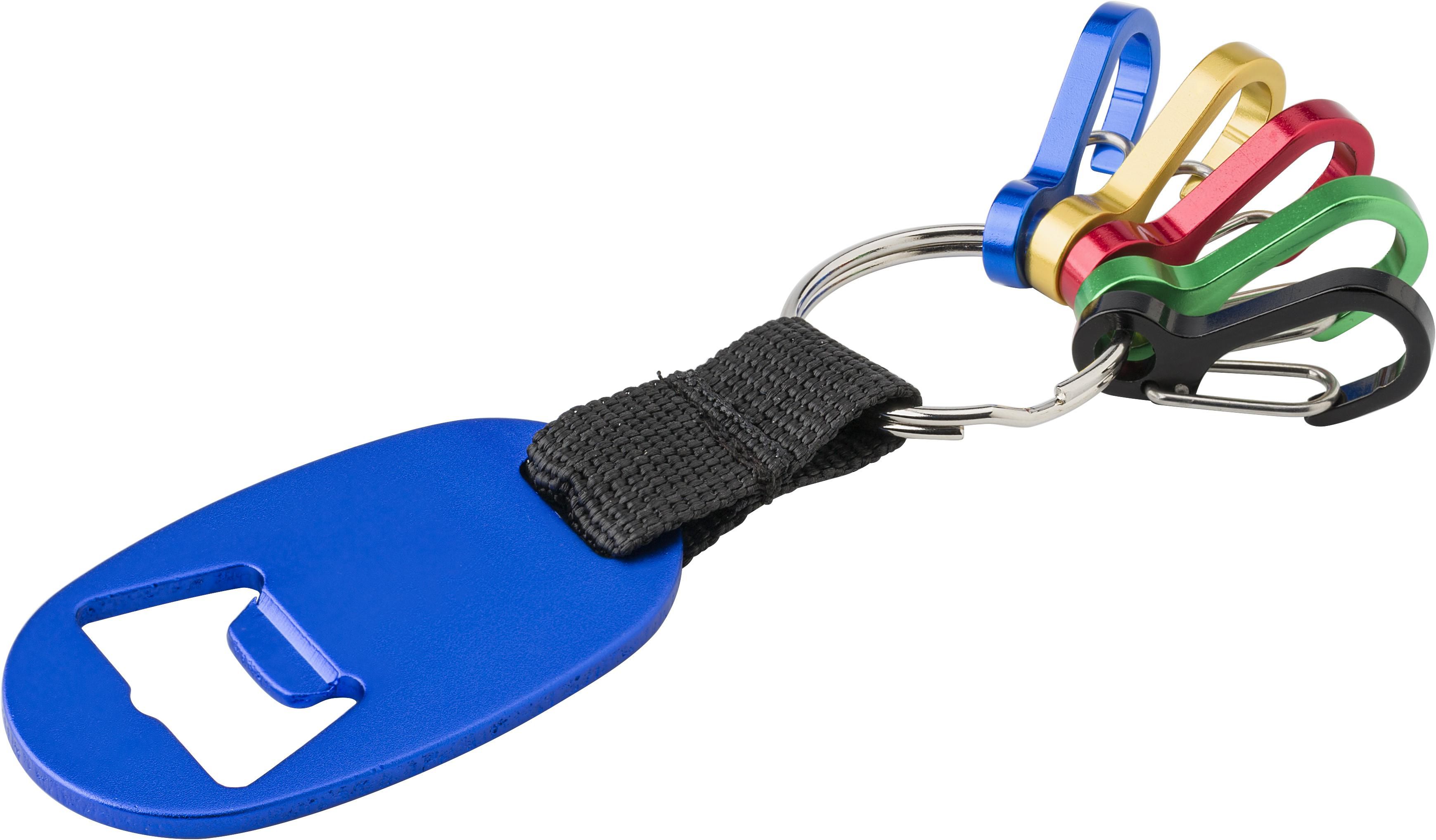 Schlüsselanhänger aus Aluminium, mit Flaschenöffner, Polyesterband, Schlüsselring und fünf kleinen Karabinerhaken in fünf verschiedenen Farben (Blau, Rot, Gold, Grün und Schwarz).