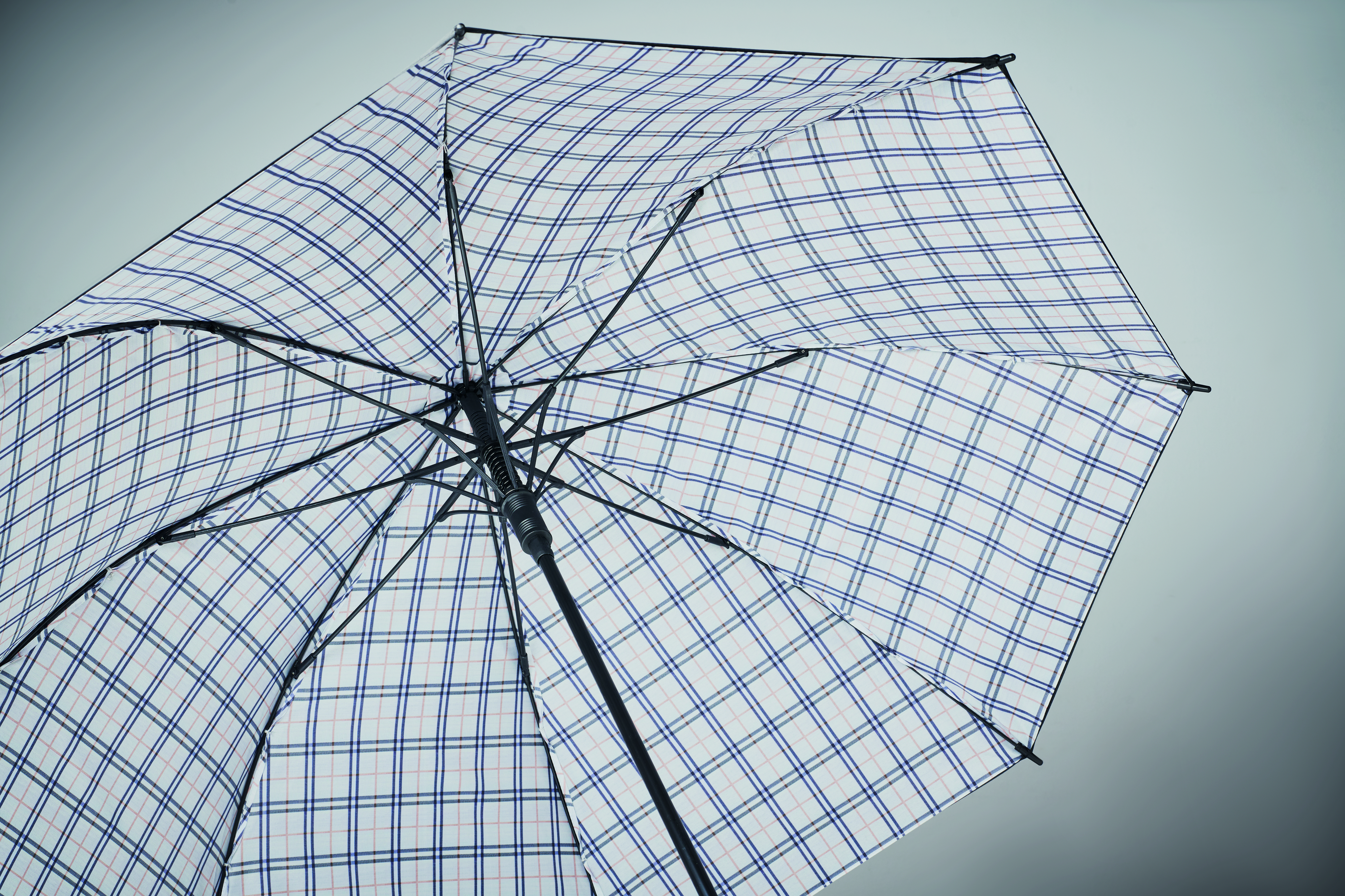 23'''' Regenschirm aus 190T Pongee. Windbeständig. Karierte Innenseite. Stangen aus Fiberglas, schwarz beschichteter Stock und Spitzen aus Kunststoff. Gebogener, gummierter Griff. Automatische Öffnung, manuelle Schließung.