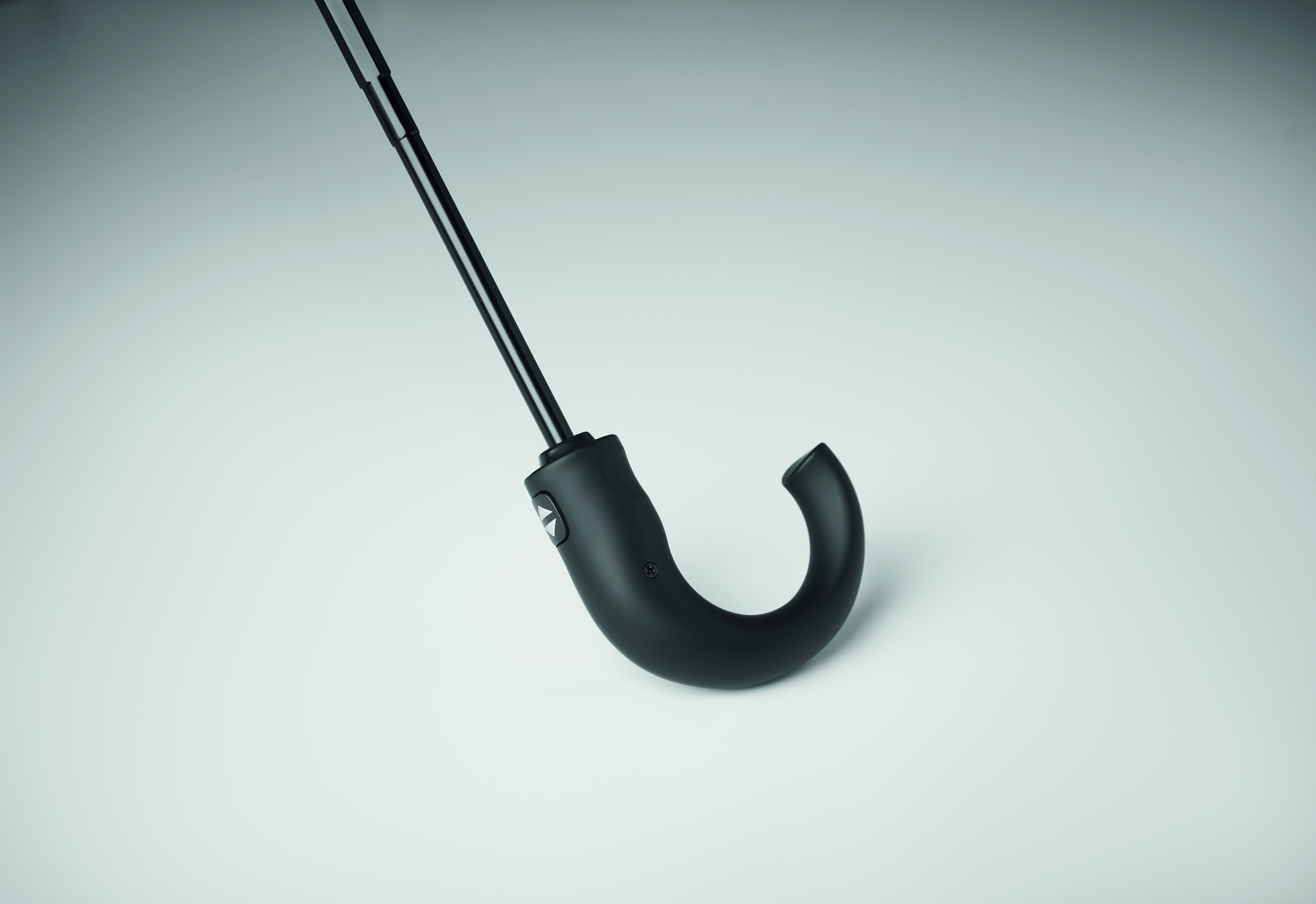 23'''' Regenschirm aus doppellagigem 190T Pongee, 3fach gefaltet. Windbeständig. Karierte Innenseite. Schwarz beschichteter Stock und Stangen. Mittelteil aus schwarzem, vernickeltem Fiberglas. Gebogener, gummierter ABS-Griff. Automatische Öffnung und Schließung.
