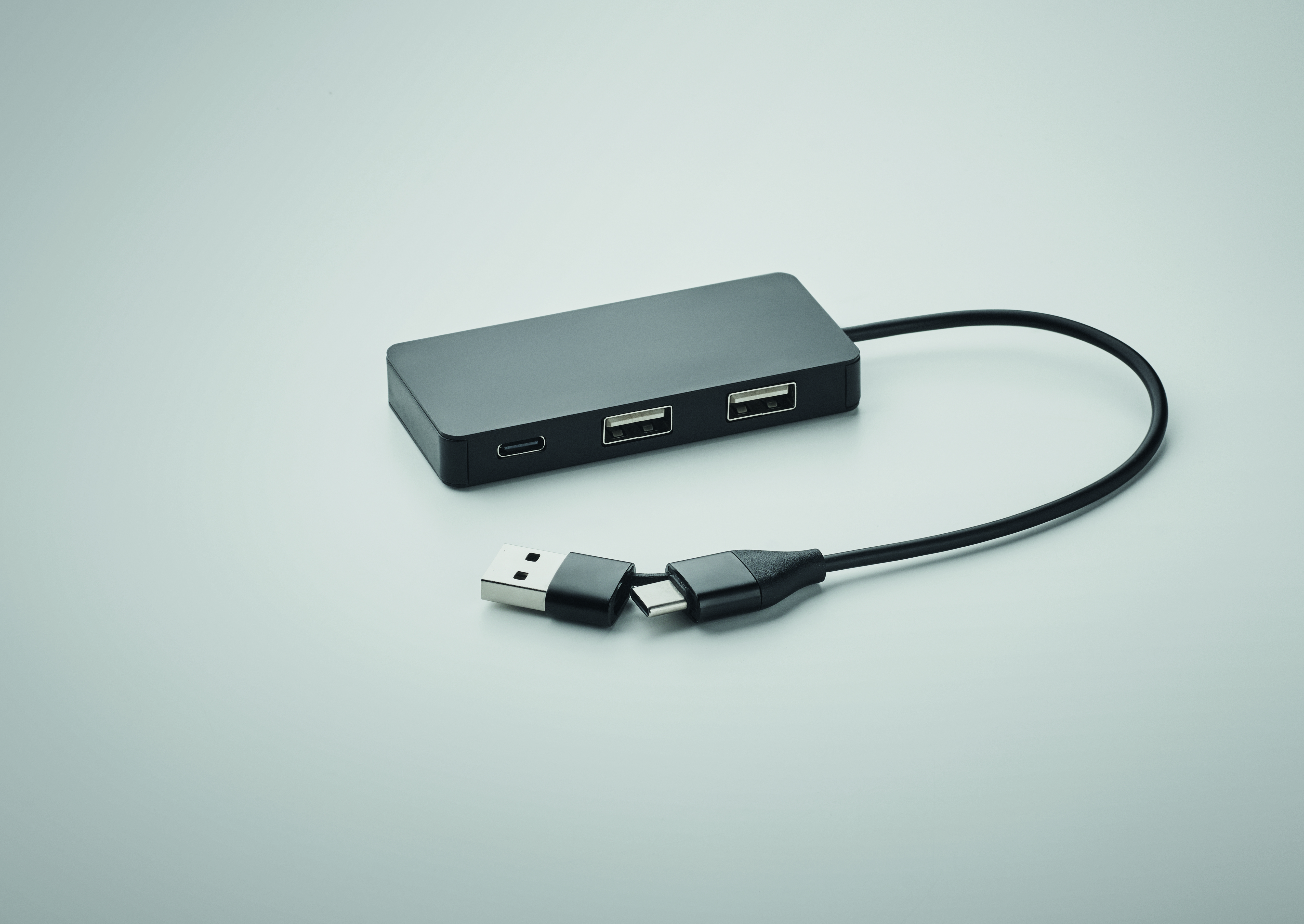 USB Hub aus recyceltem Aluminium mit Ladekabel. Ausgang: 2 x Typ-A und 1 x Typ-C. Eingang: 2-in-1 Typ-C und Typ-A. Kabellänge: 20 cm.