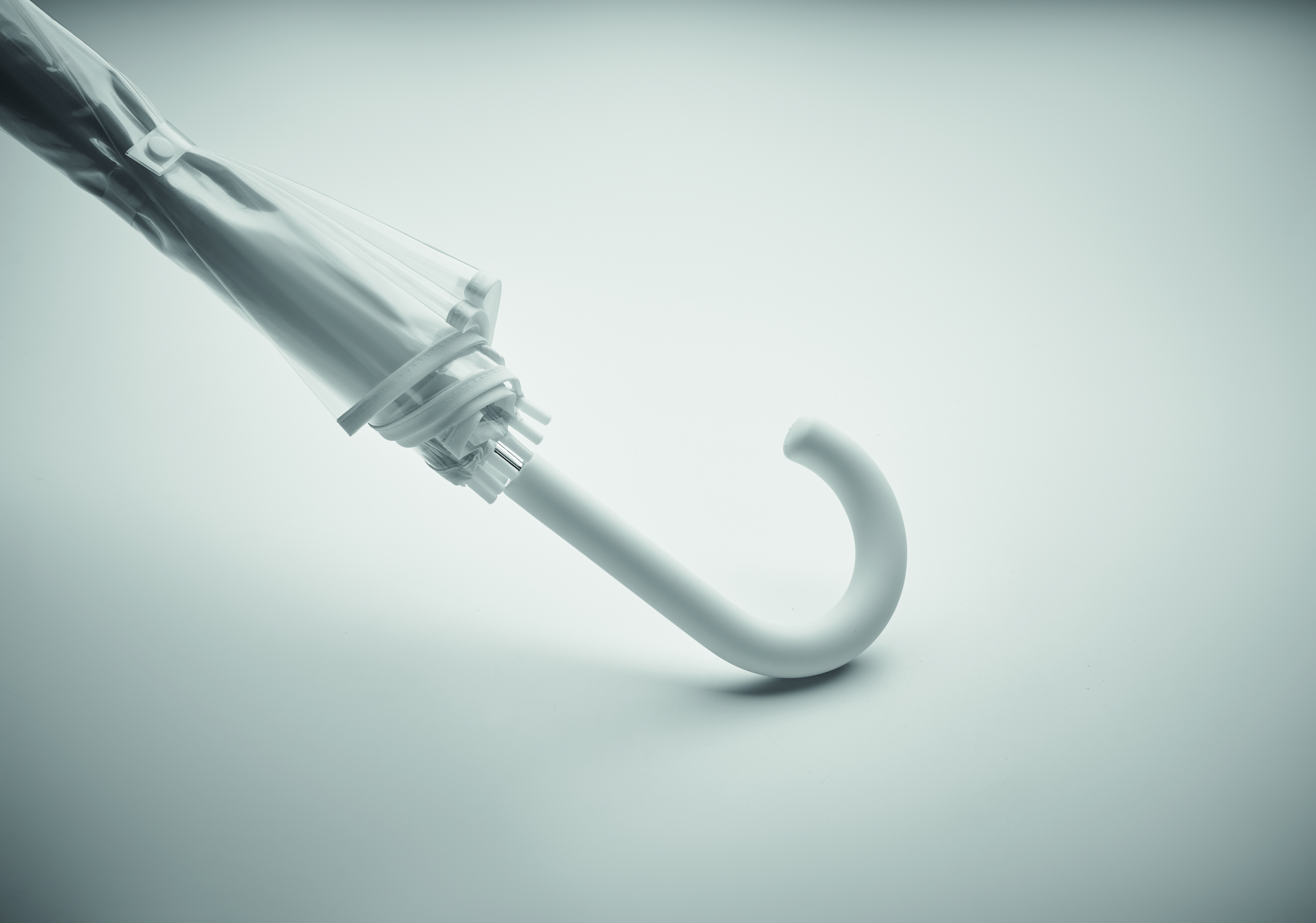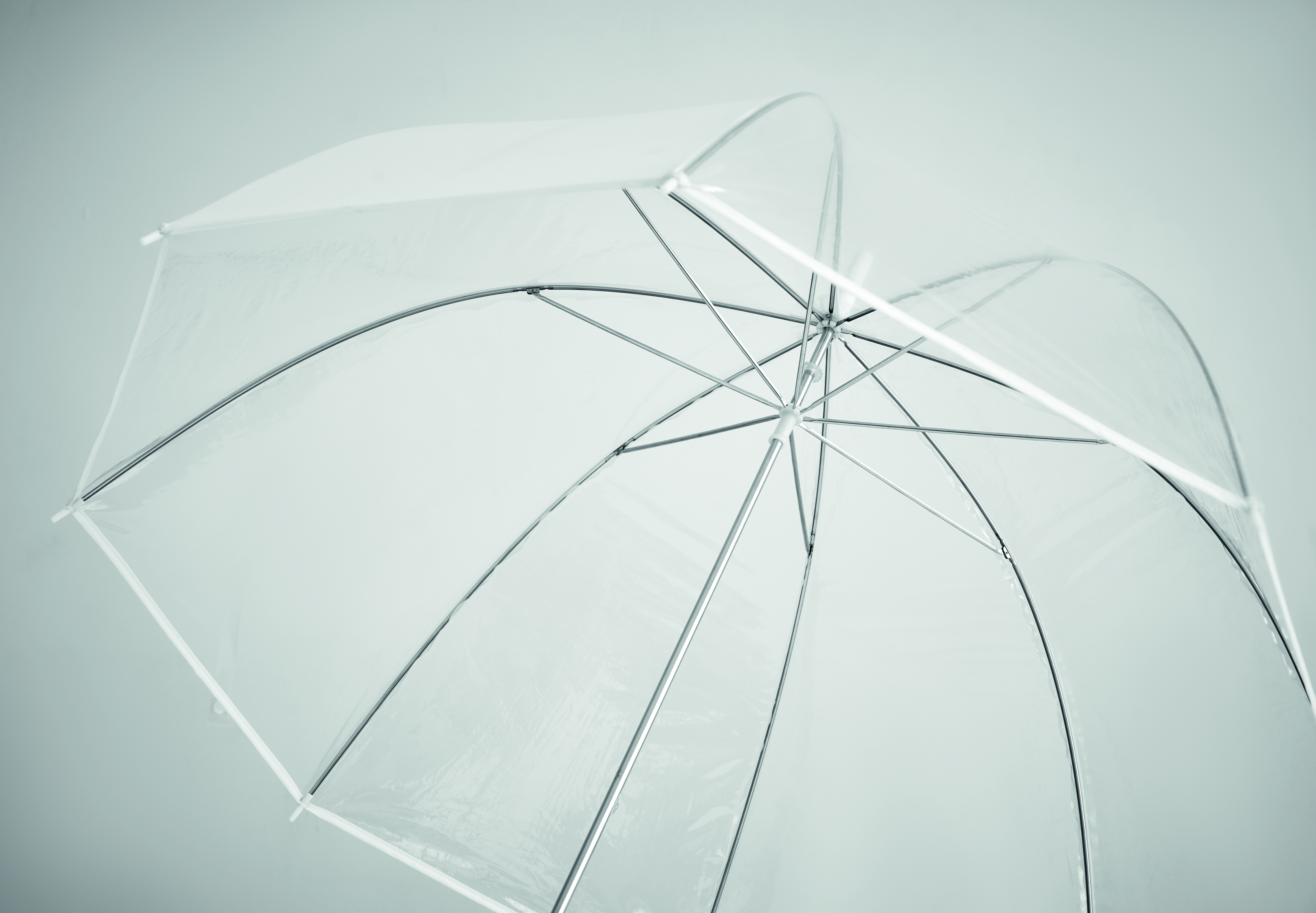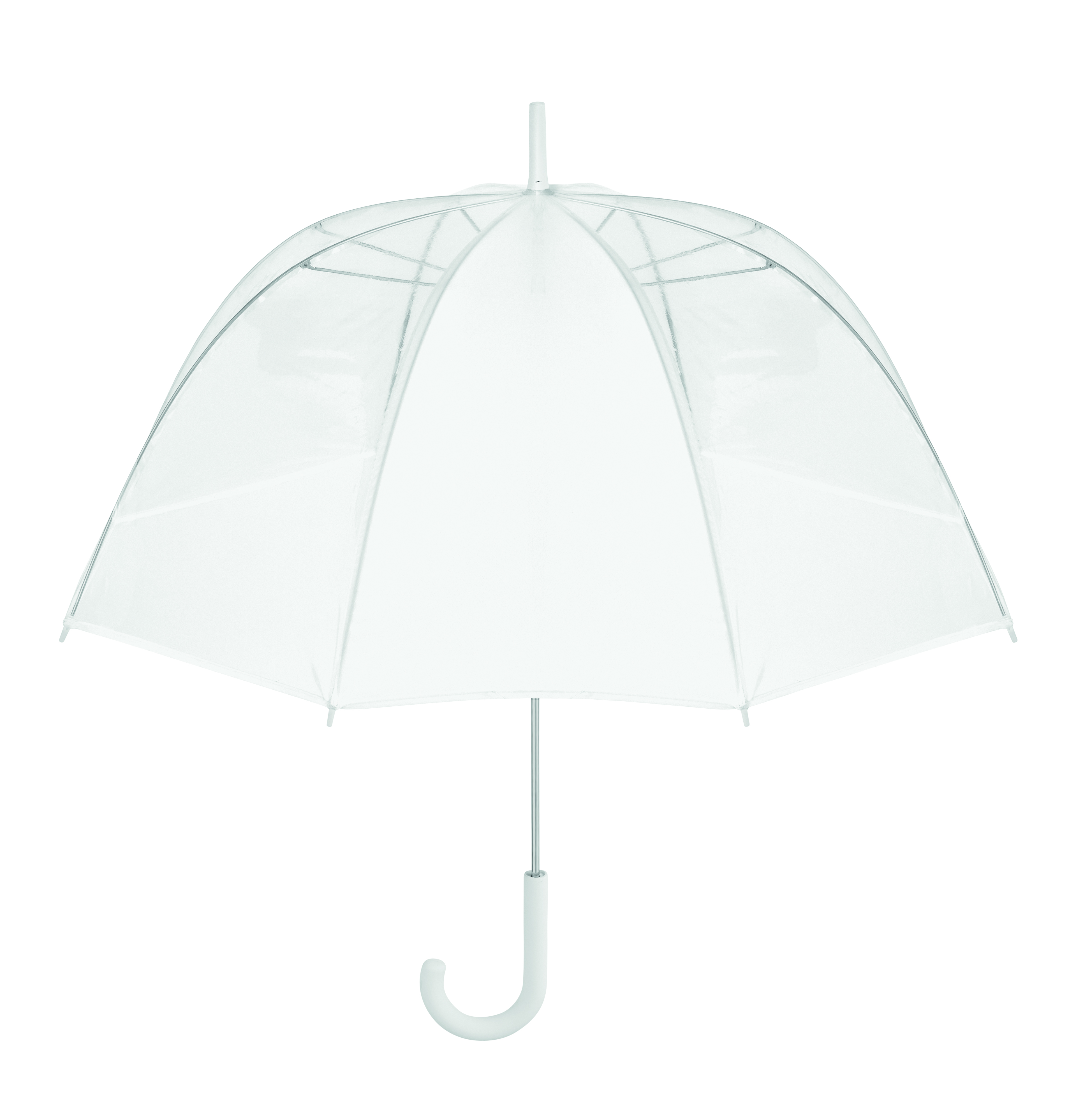 23'''' Regenschirm aus POE. Farbige Paspel. 1 Segment aus Polyester dient als Druckbereich. Verchromter Stock, Stangen aus Fiberglas, Spitzen aus Kunststoff. Gebogener, gummierter Griff. Manuelle Öffnung und Schließung.
