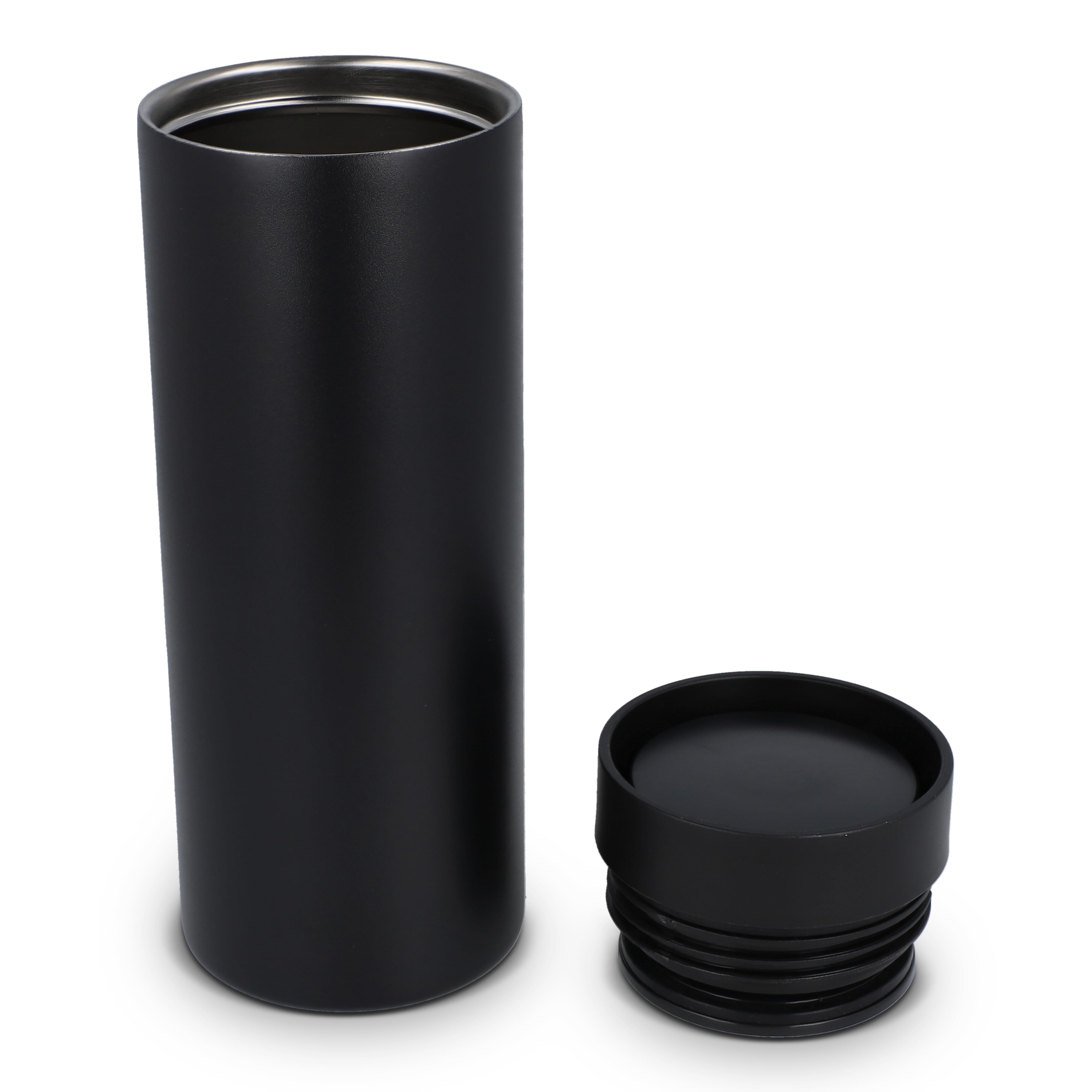 Moderner Thermobecher aus recyceltem Edelstahl (400 ml) mit einem cleveren Druckknopfdeckel und einer 360-Grad-Trinkmöglichkeit. Lasergravierte Logos mit Chromeffekt oder digitale Hochglanzlogos mit dezentem Effekt. Jedes Produkt ist in einer Geschenkbox verpackt.