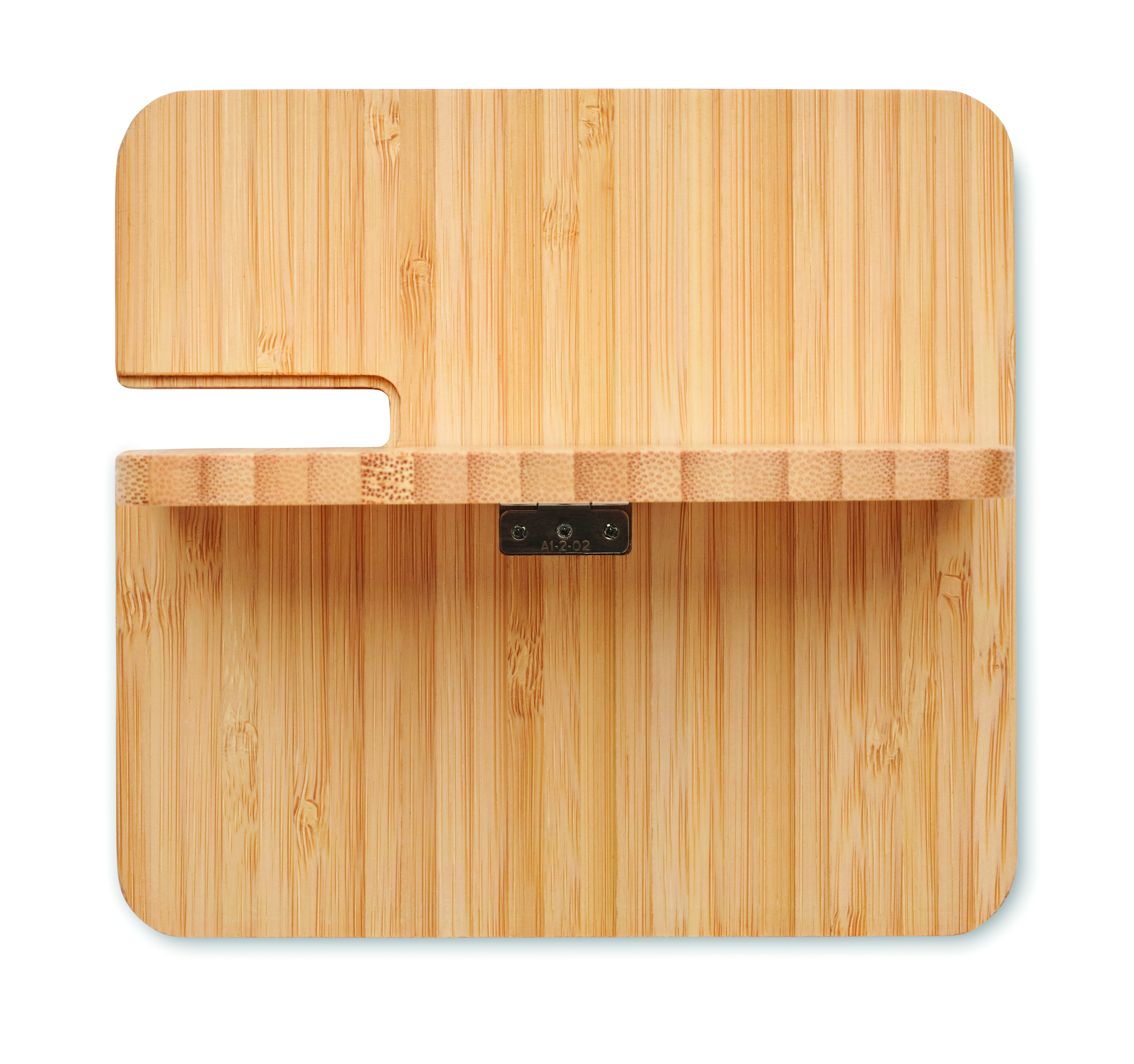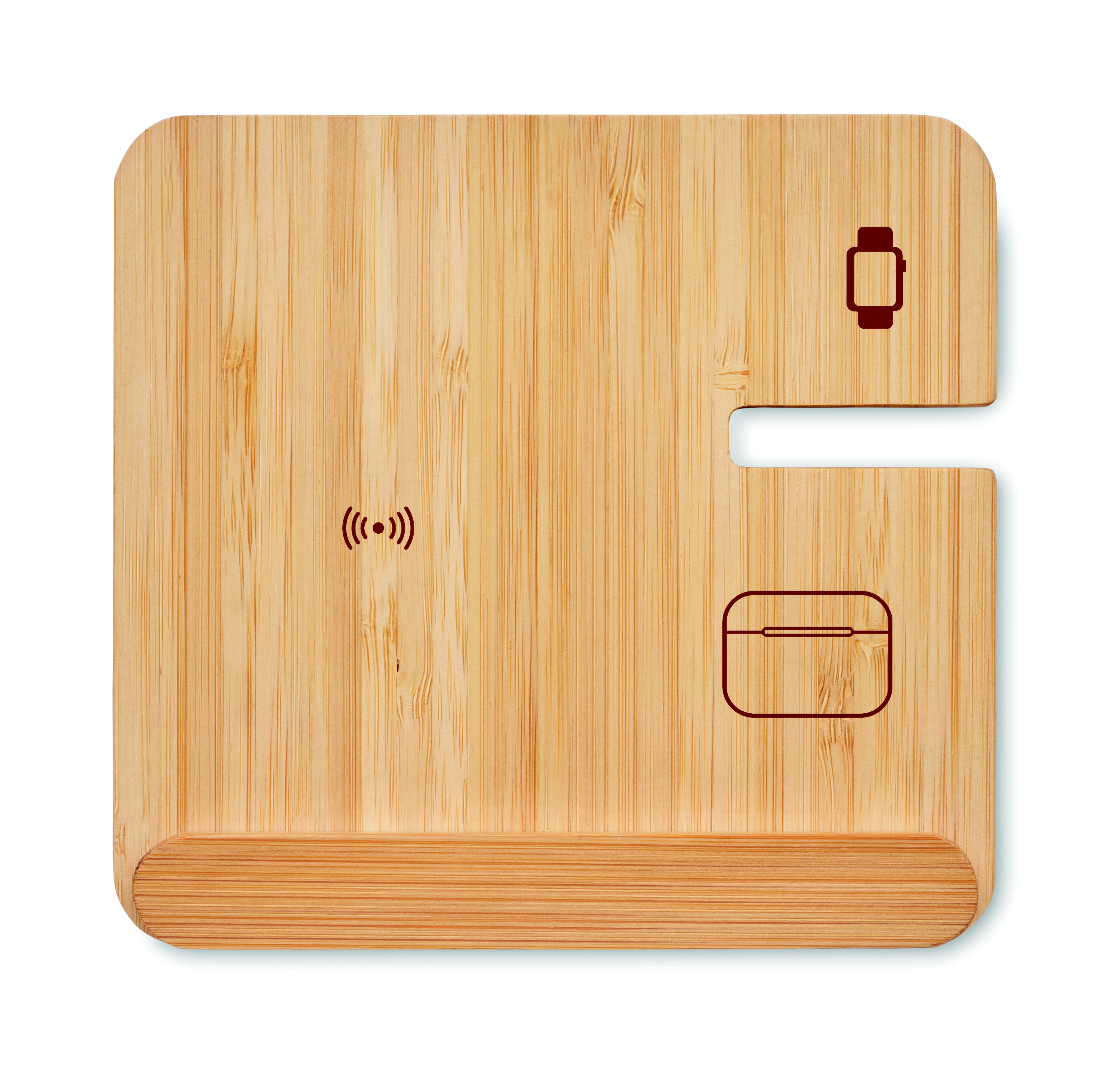 3in1 faltbare Ladestation im Gehäuse aus Bambus mit Smartphone-Halter. Inkl. kabelloses Dual-Coil-Ladegerät (15 W), Smartwatch-Ladegerät (nur Apple®) und TWS-Ladegerät.