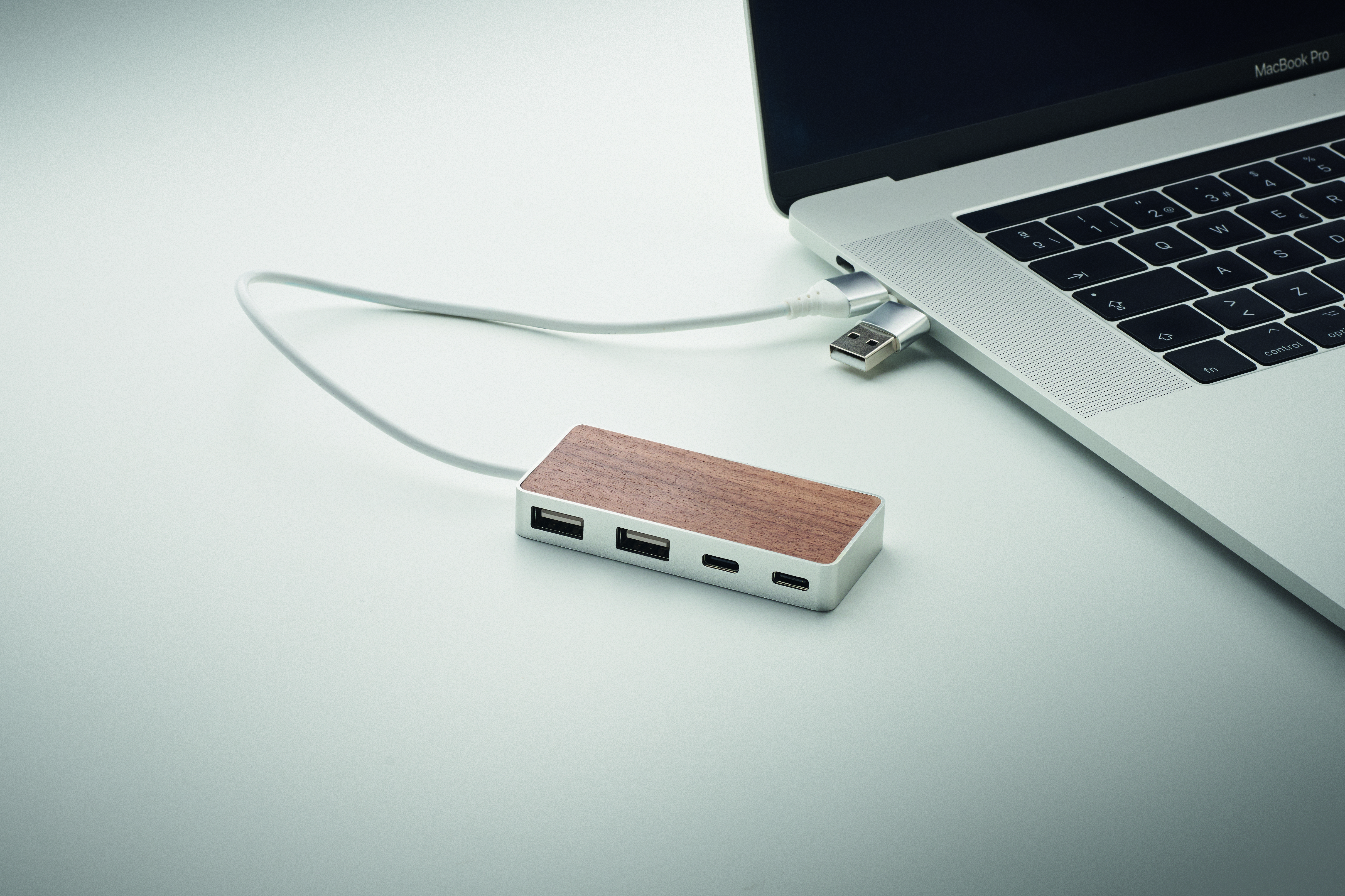 4 Port USB-Hub in einem Gehäuse aus recyceltem Aluminium und Dekor aus Walnussholz. Ausgang: 2 x Typ-A und 2 x Typ-C. Eingang: 2-in-1 Typ-C und Typ-A. Kabellänge: 27,5 cm.