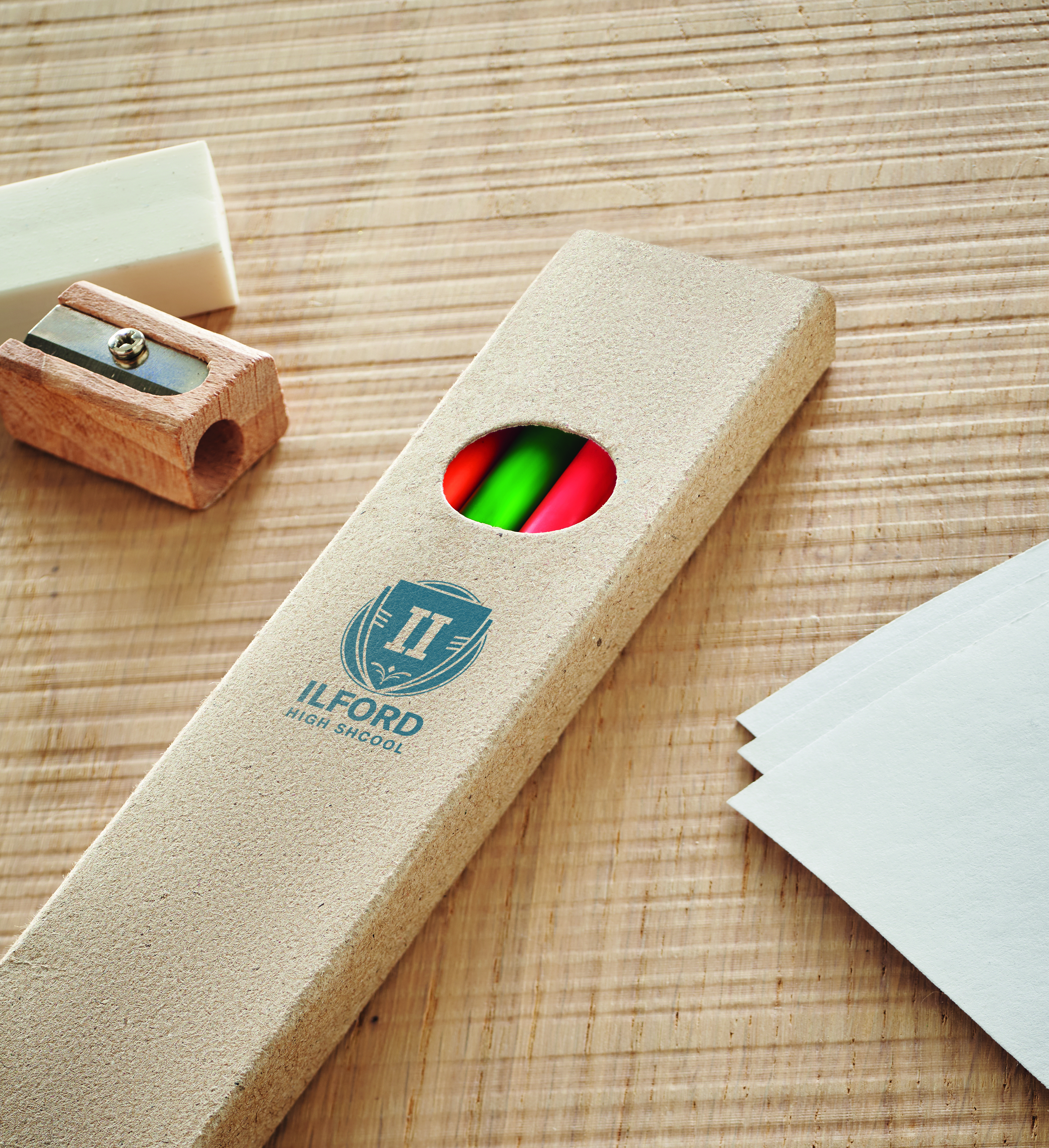 Set mit 4 Textmarker-Buntstiften in einer Schachtel aus recyceltem Papier.