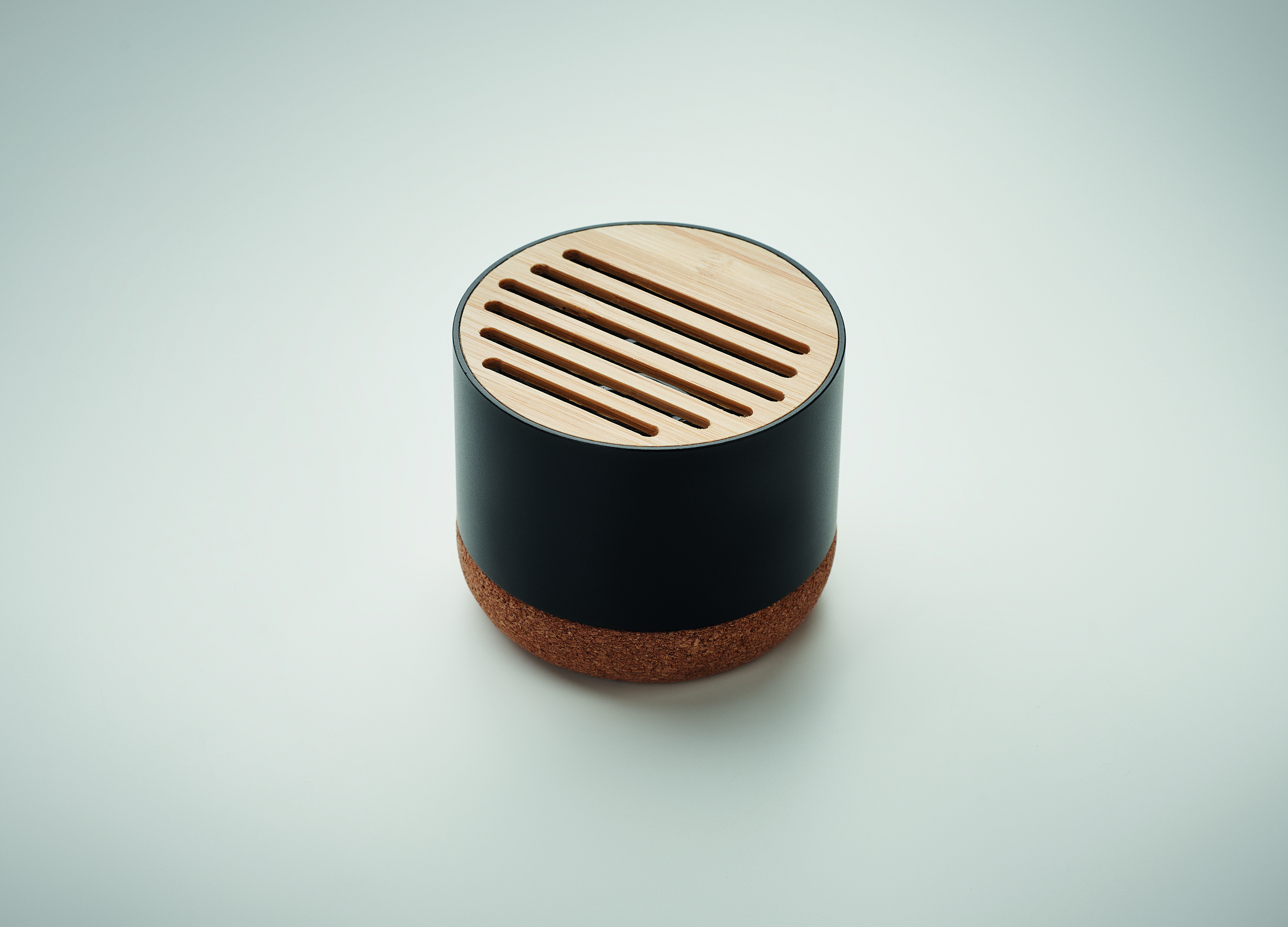 5.3 wireless Lautsprecher. Gehäuse aus recyceltem Aluminium mit Details aus Kork und Bambus. Inkl. 1 wiederaufladbarer Li-ION-Akku mit 400 mAh. Ausgangsdaten: 3 W, 3 Ohm und 5 V. Spielzeit ca. 3 Stunden.