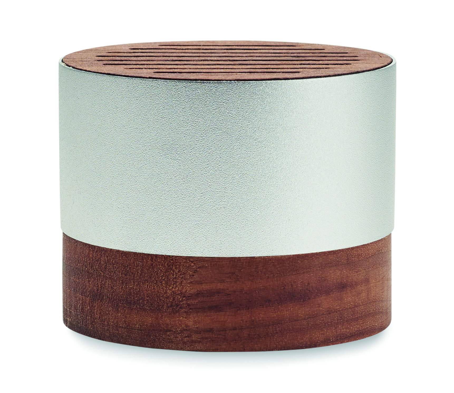 5.3 wireless Lautsprecher. Gehäuse aus recyceltem Aluminium mit Details aus Walnussholz. Inkl. 1 wiederaufladbarer Li-ION-Akku mit 300 mAh. Ausgangsdaten: 3 W, 3 Ohm und 5 V. Spielzeit ca. 3 Stunden.