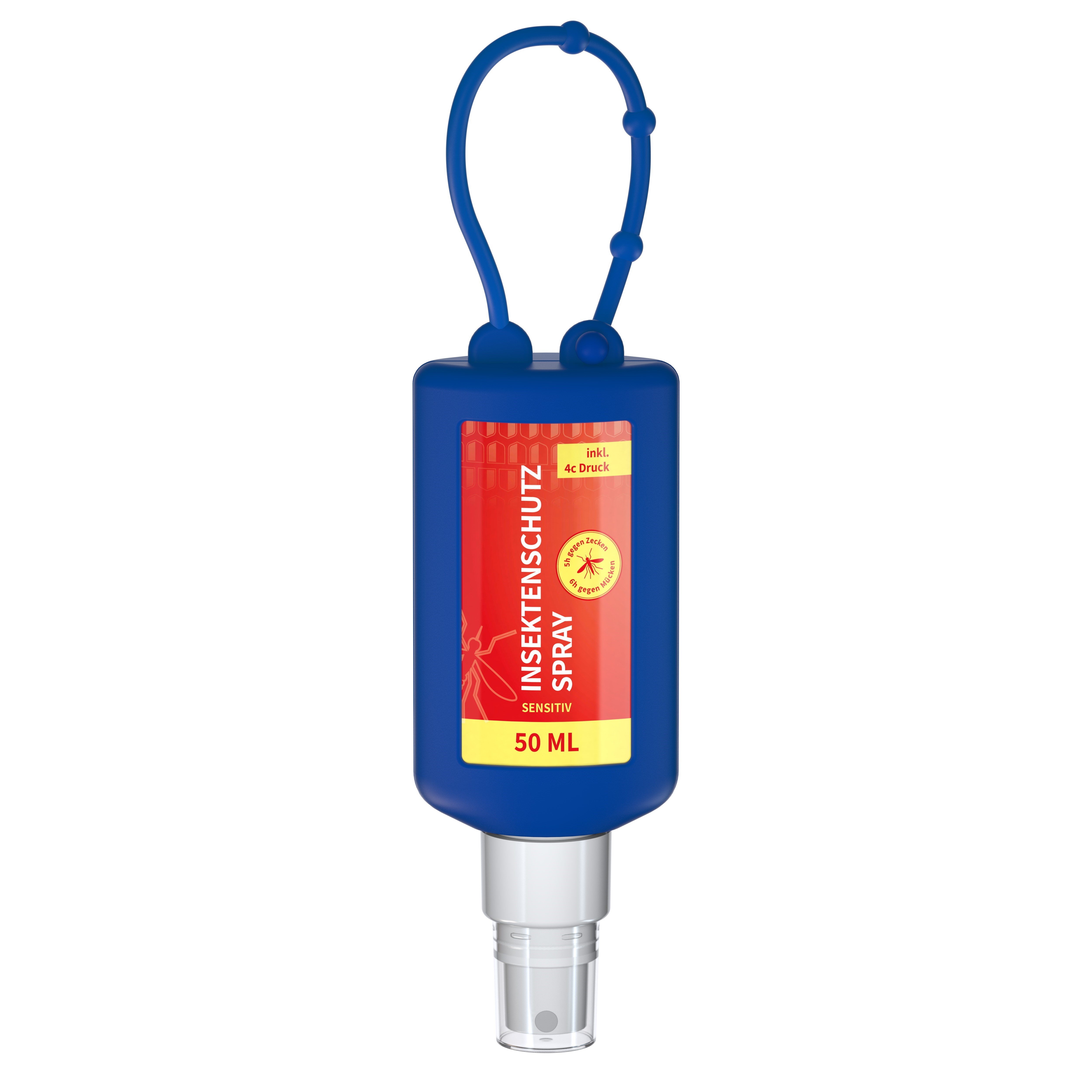50 ml Bumper blau - Insektenschutz-Spray sensitiv - Body Label als Werbeartikel mit Logo und kurzer Lieferzeit.