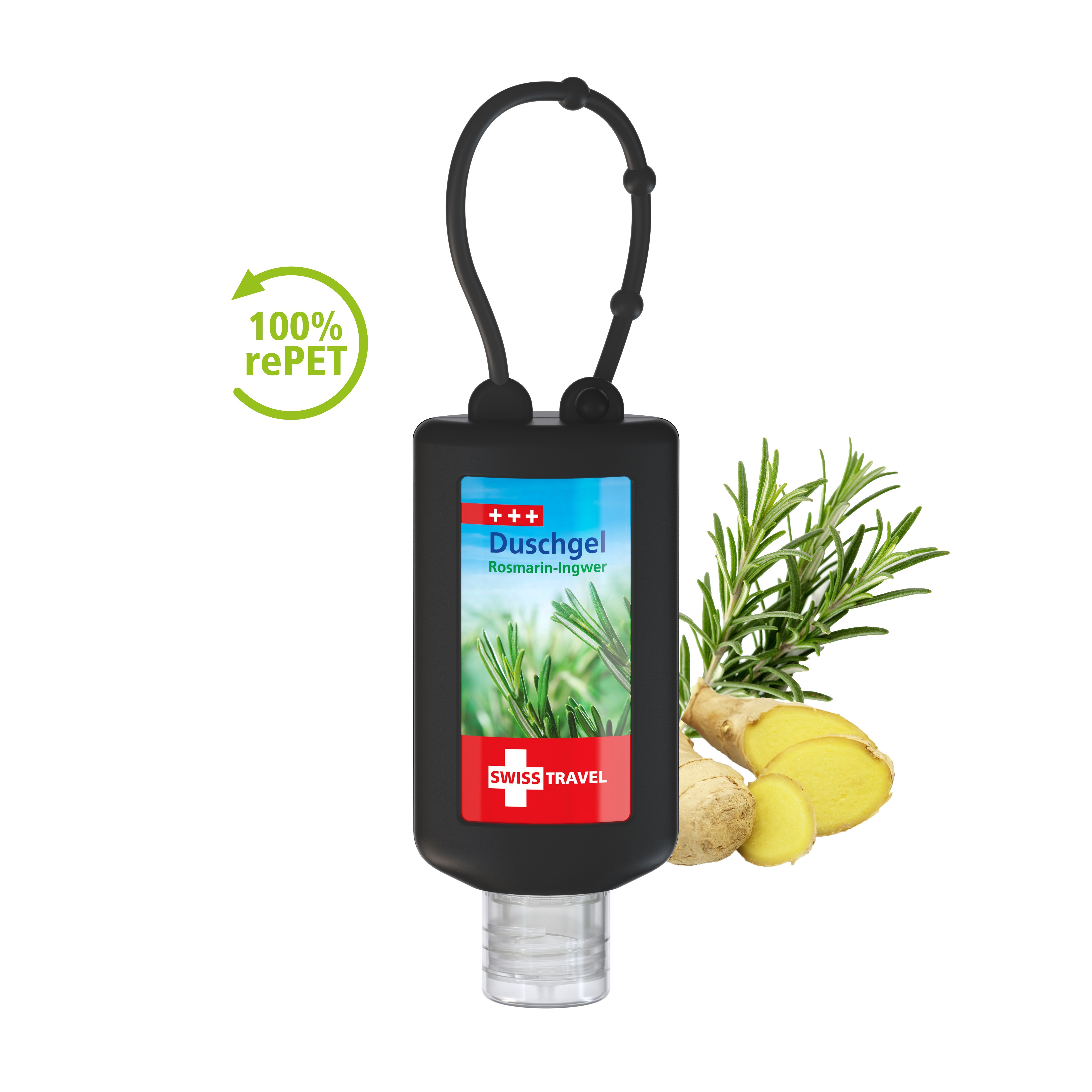 50 ml Bumper schwarz - Duschgel Rosmarin-Ingwer - Body Label mit Firmenlogo für Werbeaktionen.