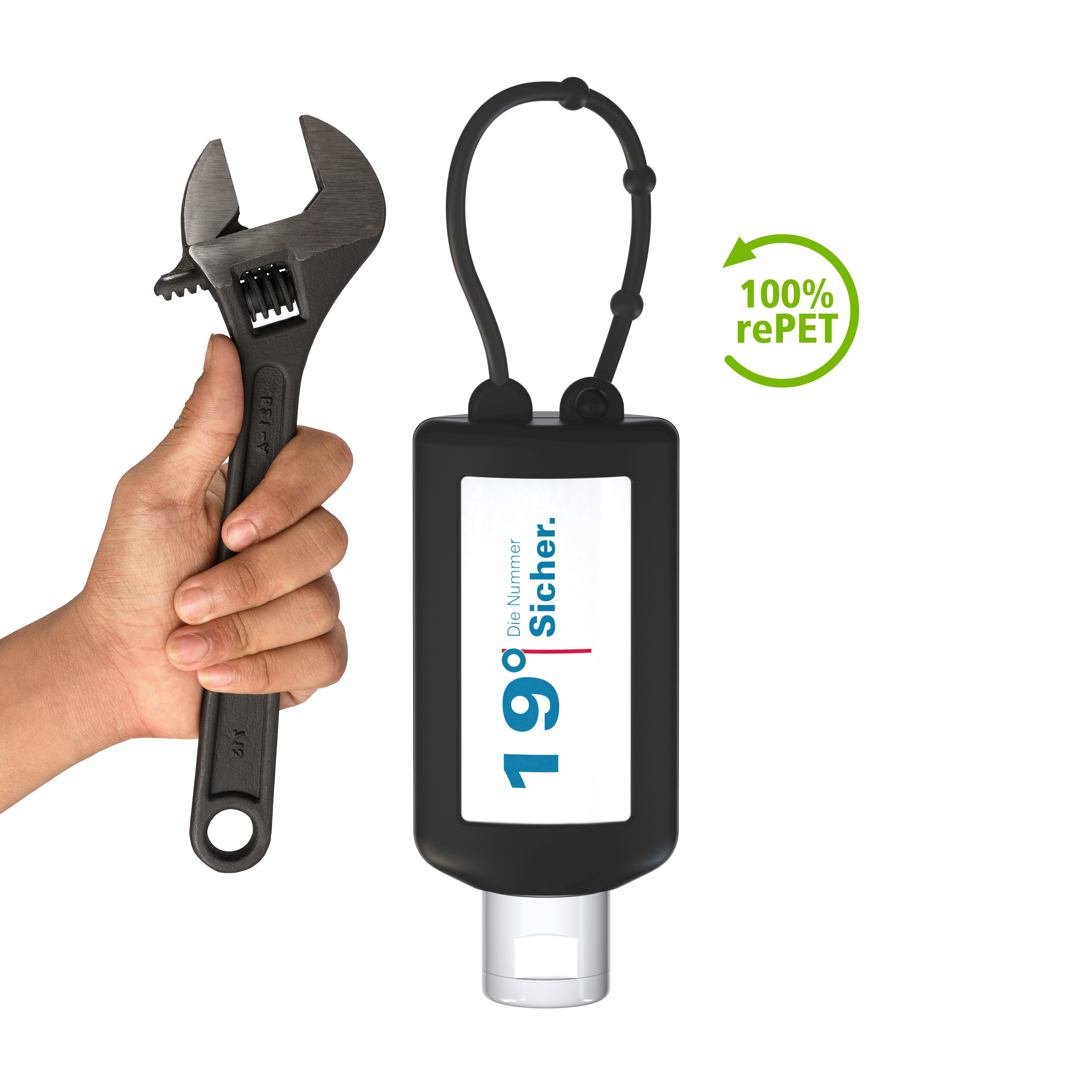 50 ml Flasche und Klappdeckel (zufällig ausgerichtet) weiß; Silikonhülle und Schlaufe in schwarz. Nachfüllbar. Flasche hergestellt aus 100% recyceltem PET, weiß mit leichter R-PET-Färbung.
