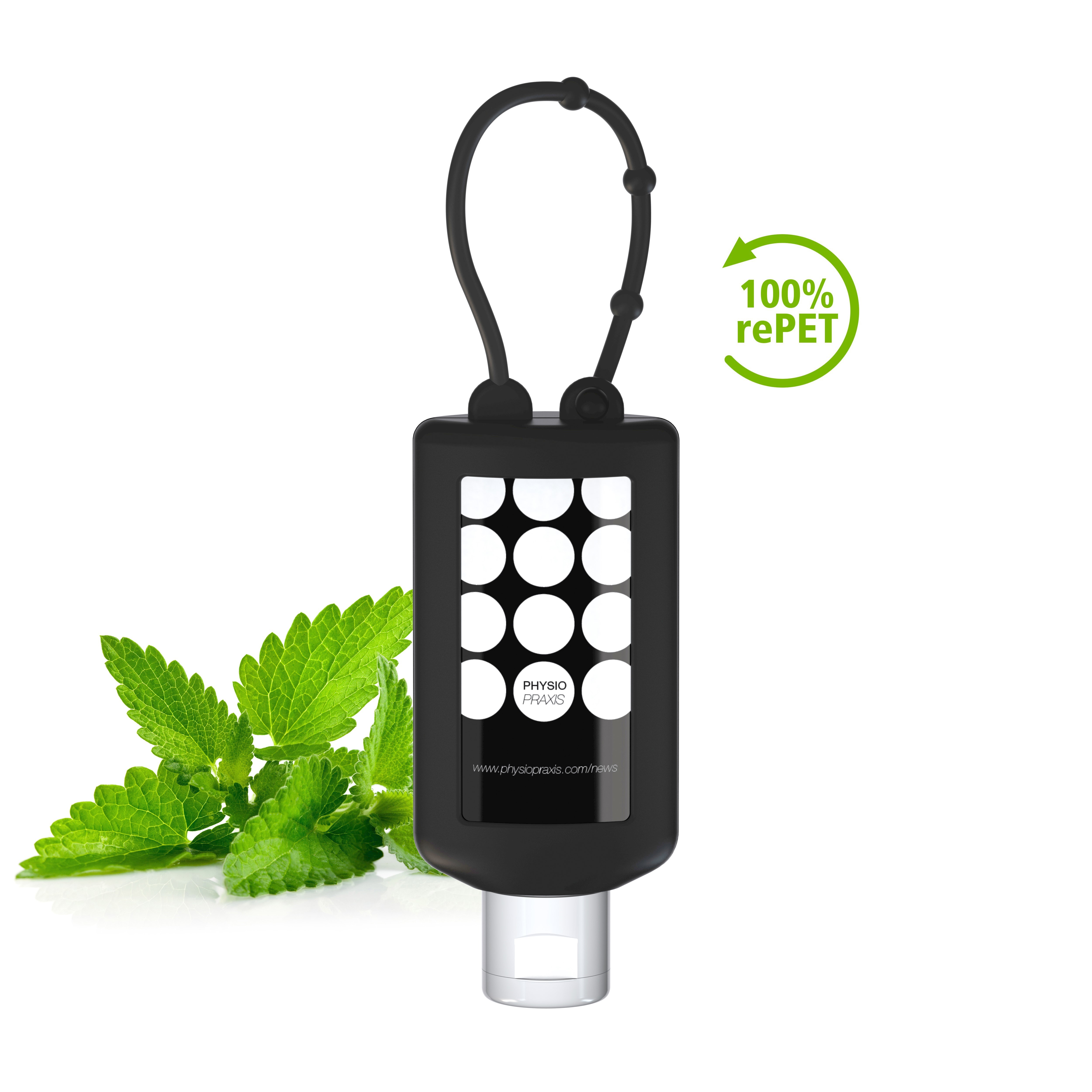 50 ml Flasche und Klappdeckel (zufällig ausgerichtet) weiß; Silikonhülle und Schlaufe in schwarz. Nachfüllbar. Flasche hergestellt aus 100% recyceltem PET, weiß mit leichter R-PET-Färbung.