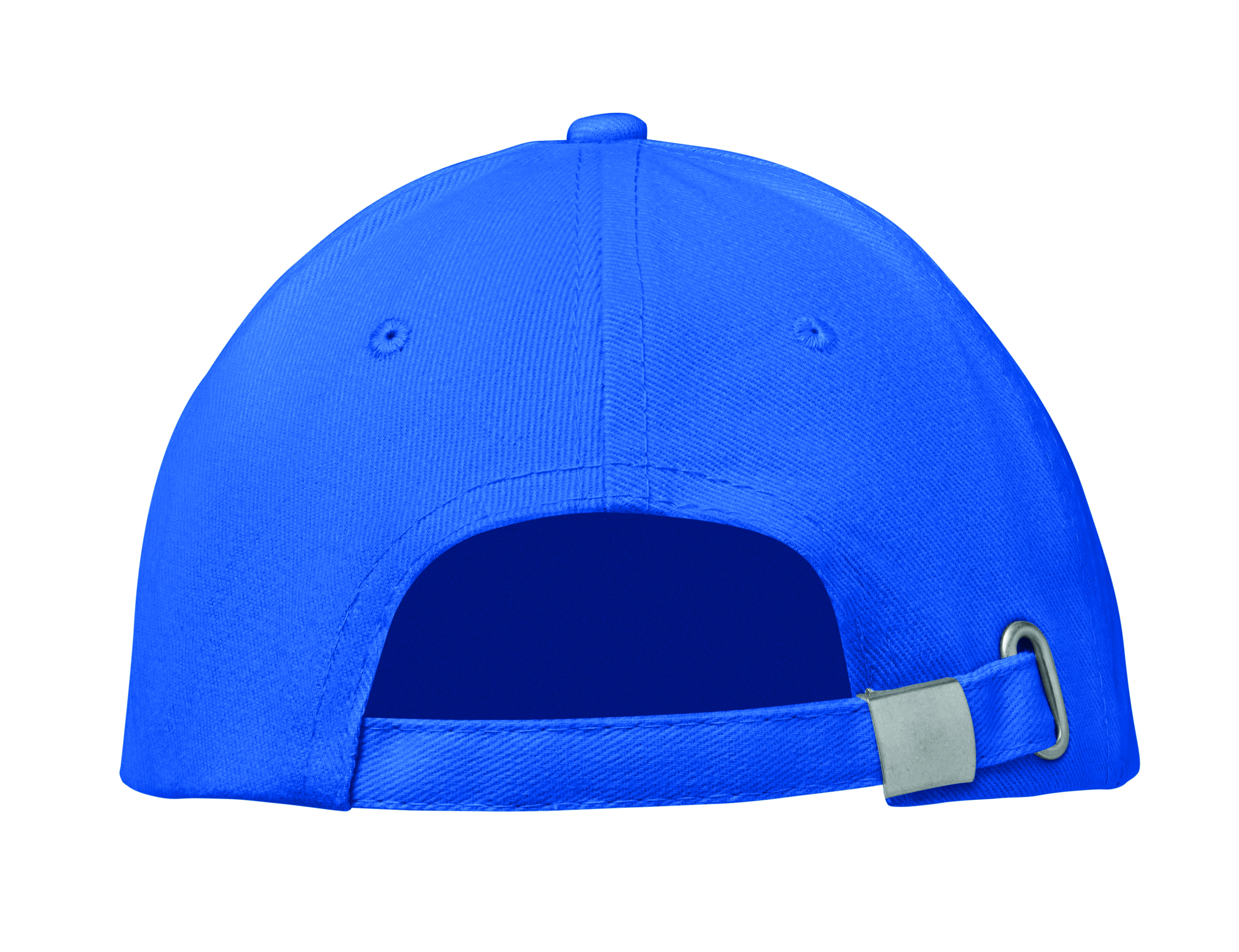 6-Panel-Baseball-Cap aus gebürsteter Baumwolle 260 g / m² mit silberner Schnalle aus Stahl mit Einstecklasche. Sechs farblich abgestimmte, umstickte Belüftungslöcher. Größe 7 1/4.