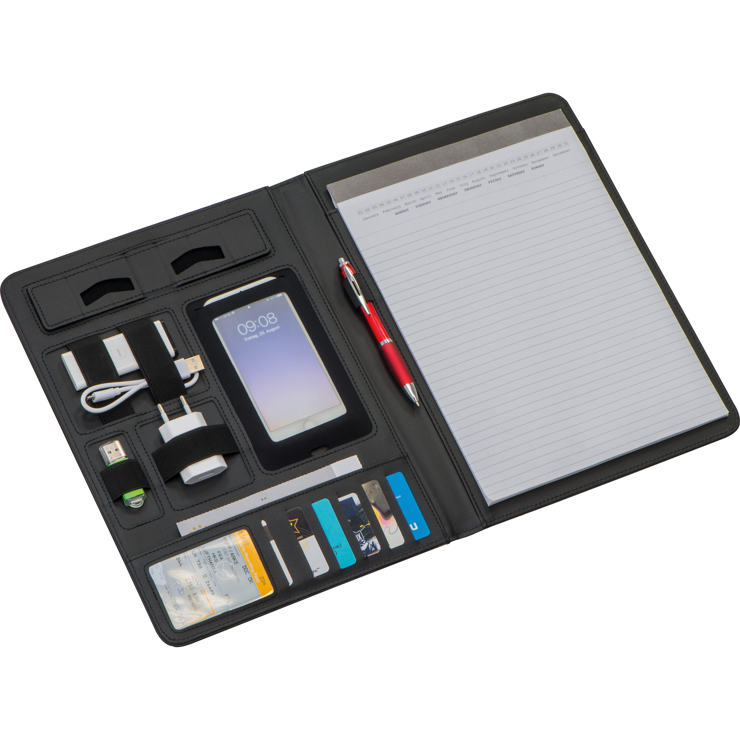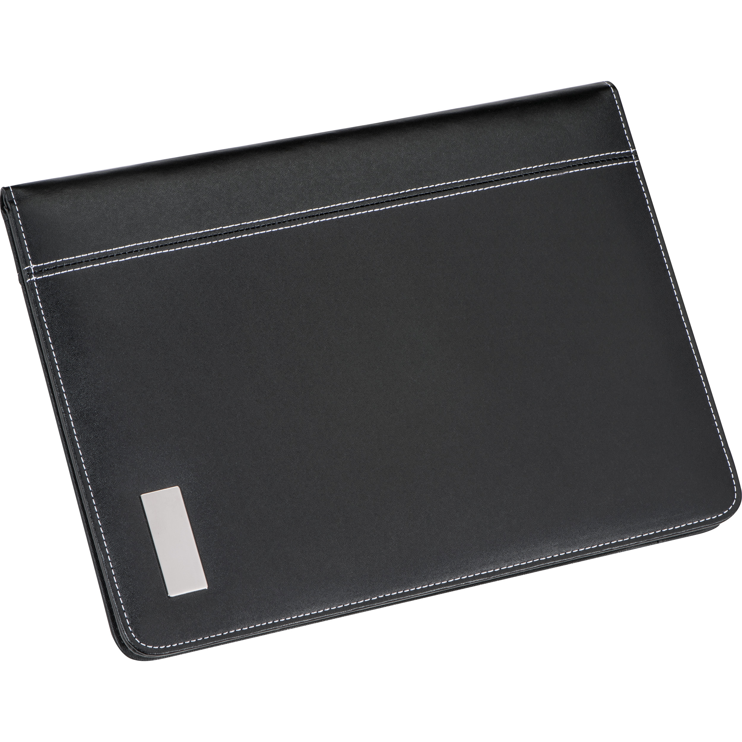 Schreibmappe A4 aus hochwertigem Kunstelder mit Steckfächern, Visitenkartenfächern, Kugelschreiberschlaufe, Smartphonehalterung, Ständer und liniertem Block mit Kalendereindruck. Ihre Werbung wird auf das äußere Metallplättchen gelasert.