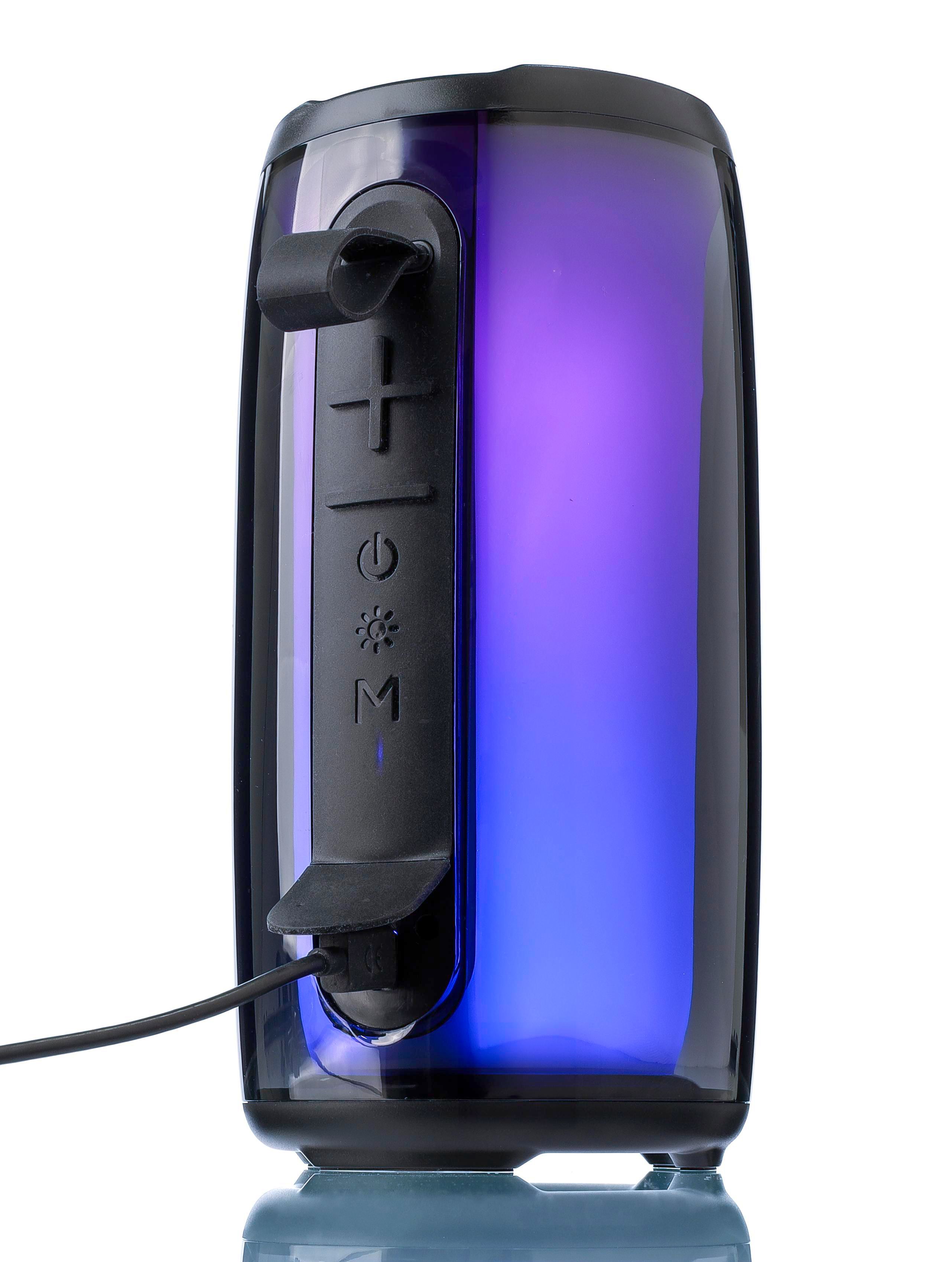 Außenlautsprecher aus ABS und PS mit mehreren RGB-Lichtmodi. IPX6-zertifiziert. 5W Leistung, DC 5V Eingang, 1200mAh eingebaute wiederaufladbare Batterie und 3,5 Stunden Spielzeit. Arbeitsabstand von 15-20 Metern, Signal-Rausch-Verhältnis von 87 dB. Frequenzbereich: 100 Hz bis 20 kHz. Inklusive 30 cm Typ-C-Ladekabel. Drahtlose Verbindungstechnologie: 4.2. Einzeln verpackt in einer braunen Pappschachtel.