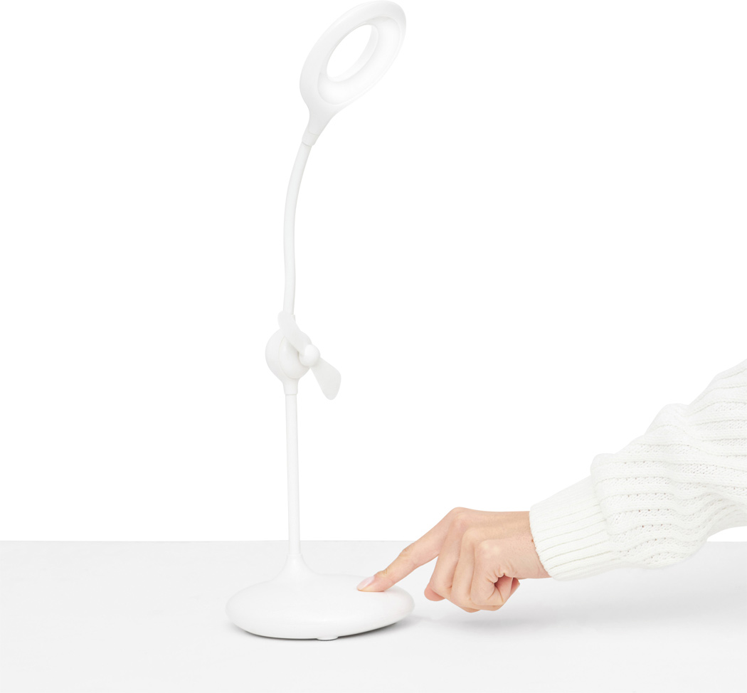 Akku-Lampe mit Ventilator FRESH LIGHT: 360° flexiblel schwenkbarer Leuchtarm mit 16 LED, An und Aus per Fingertipp, Dimmfunktion durch lange Berührung, integrierter Ventilator mit separatem Berührungssensor, inkl. USB-Ladekabel (Länge ca. 100 cm), flexibel einsetzbar dank integriertem Lithium-Akku mit 1.200 mAh, 4 rutschhemmende Füße auf der Unterseite, in Box