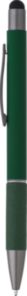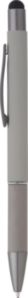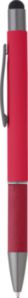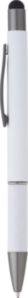Aluminiumkugelschreiber mit Details aus gerolltem Papier am Griff. Gummispitze für kapazitive Bildschirme. Blaue Tinte.