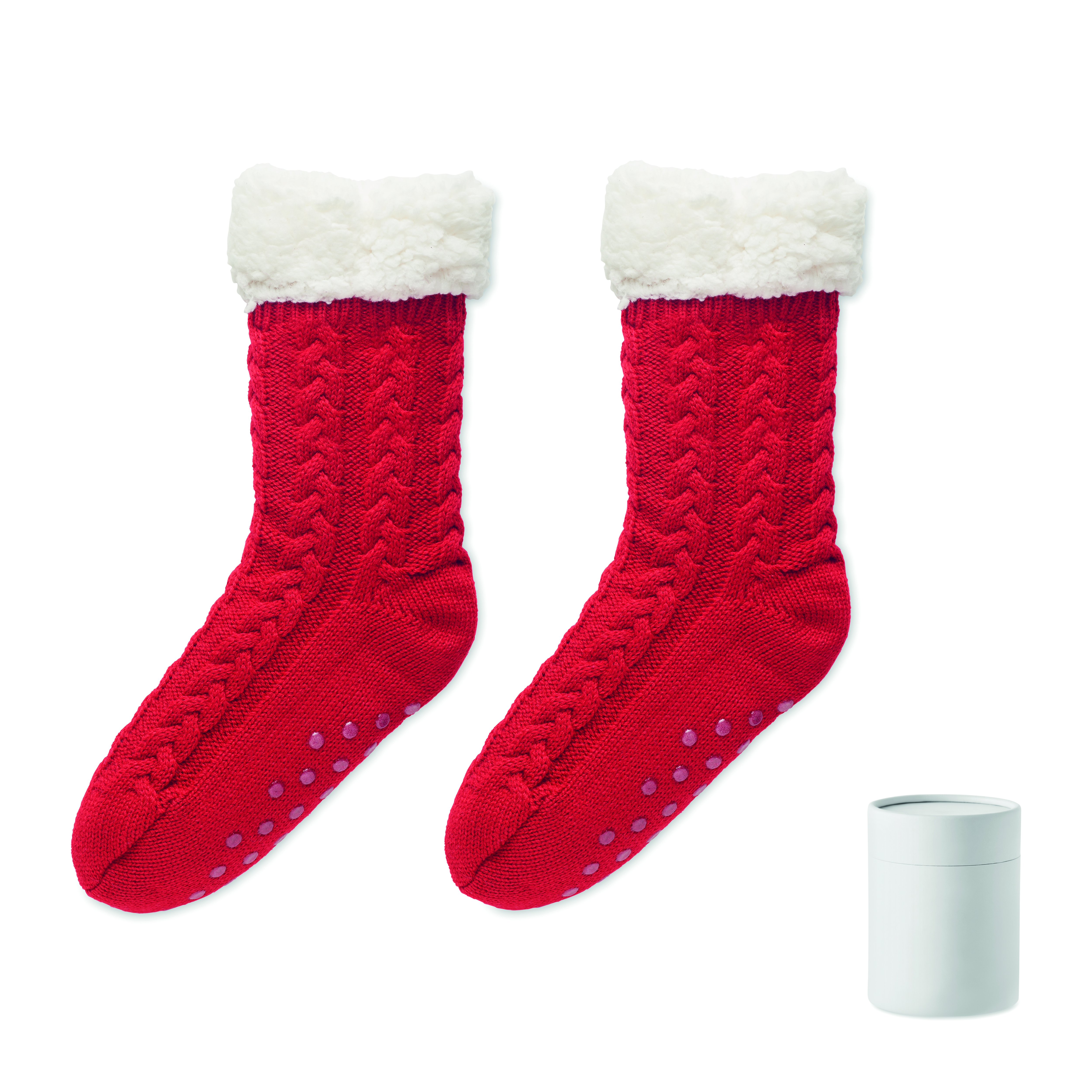 Socken mit Zopfstrickmuster und Anti-Rutsch-Sohle. Acrylgarn mit Sherpa- Futter 240 g / m². Lieferung in Hülse aus Papier. Größe L entspricht 40-43.