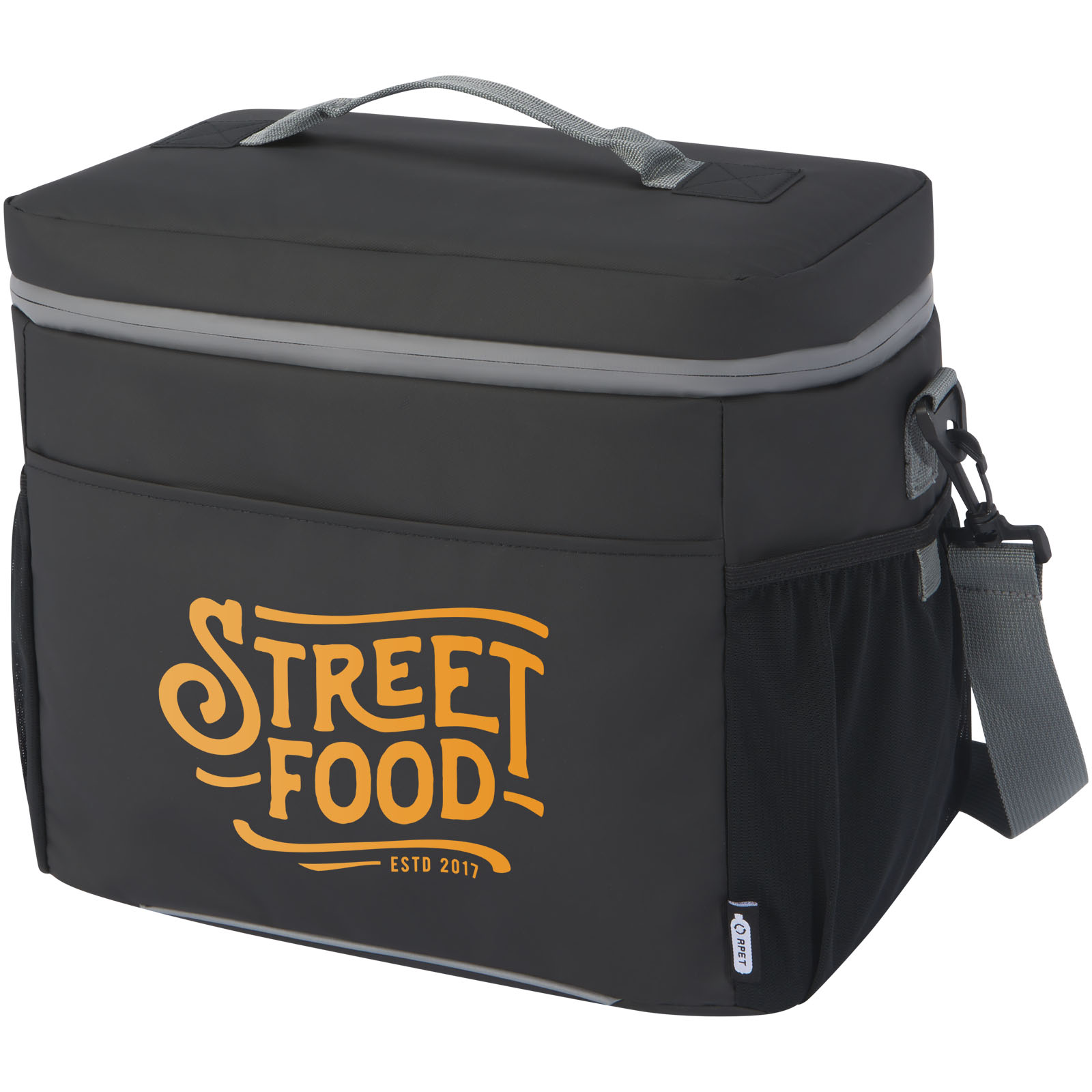 Wasserabweisende Kühltasche für 20 Dosen aus GRS-zertifiziertem Recyclingmaterial, einschließlich der Reißverschlüsse. Sie verfügt über ein geräumiges Reißverschlussfach, das mit lebensmittelechtem, extra dickem, hochdichtem PEVA und Schaumstoff ausgekleidet ist und Getränke und Erfrischungen stundenlang kühl hält. Zwei Netztaschen und eine offene Fronttasche bieten zusätzlichen Stauraum. Der Tragegriff aus Gurtband und der verstellbare, gepolsterte Schultergurt ermöglichen ein bequemes Tragen. Der Hauptstoff, das Futter, die Gurte und die Reißverschlüsse bestehen aus recyceltem GRS-Material. Kapazität: 22 Liter. PVC frei.