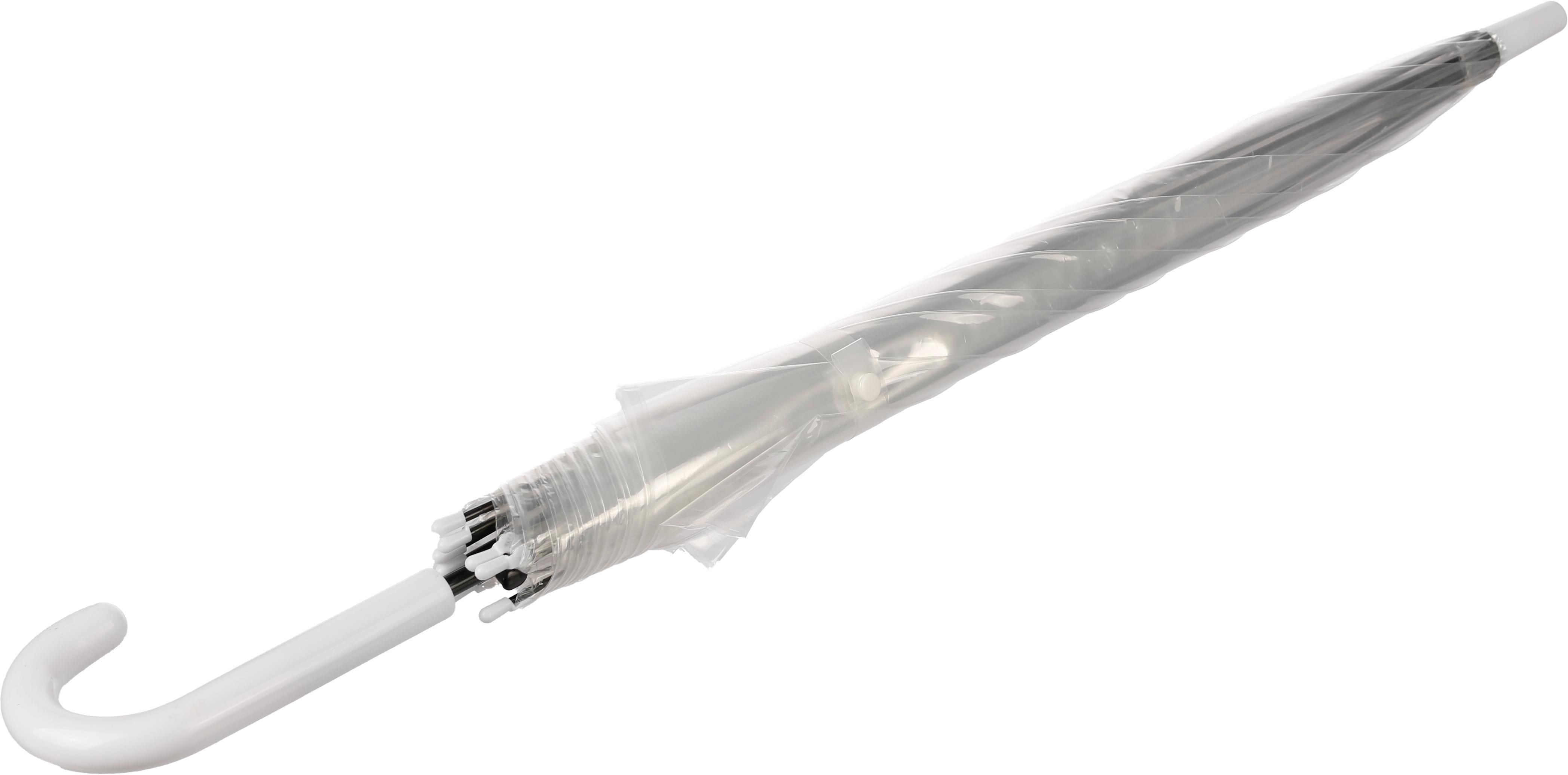 Automatik-Stockschirm mit POE-Bespannung, Krücke und Tips aus Kunststoff, Schaft und Spitze aus Aluminium, Gestell aus Metall.