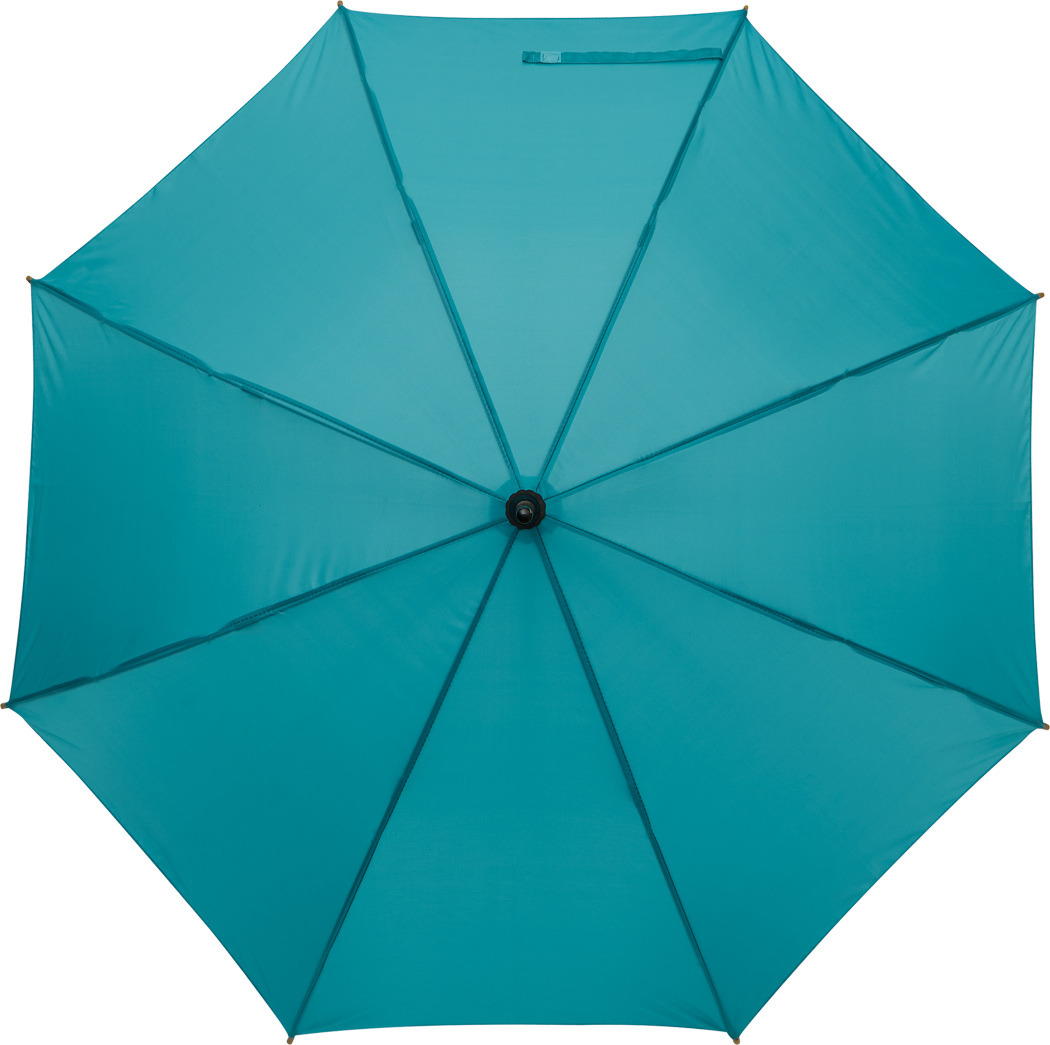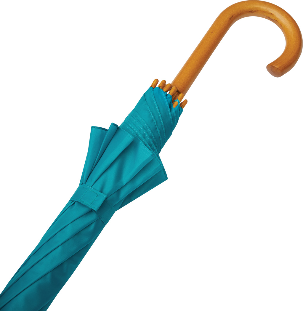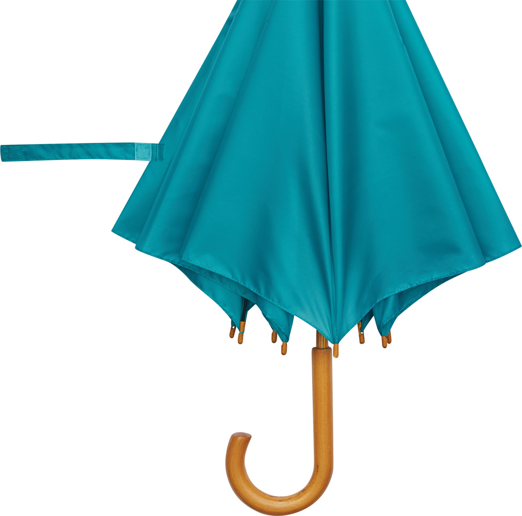Automatik-Holzstockschirm JAZZ: Fiberglasspeichen, Holztips und -Rundhakengriff, Polyester-Bespannung aus recycelten Kunststoffen / RPET, Schließband mit Klettverschluss