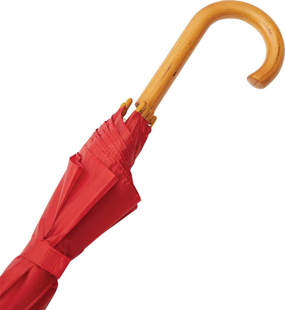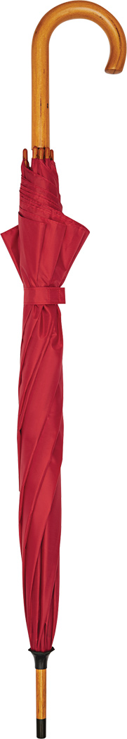Automatik-Holzstockschirm JAZZ: Fiberglasspeichen, Holztips und -Rundhakengriff, Polyester-Bespannung aus recycelten Kunststoffen / RPET, Schließband mit Klettverschluss