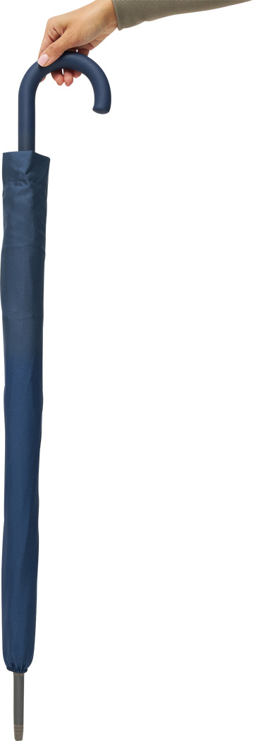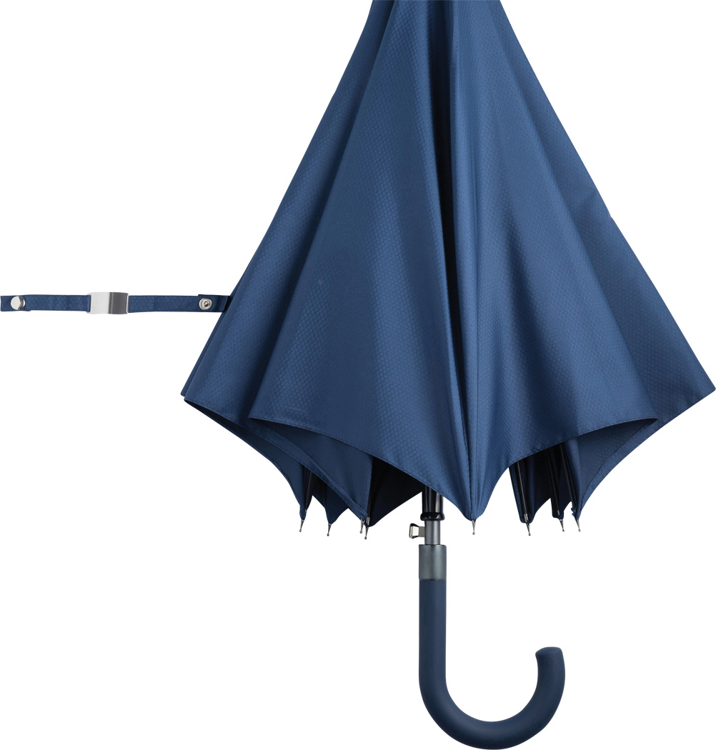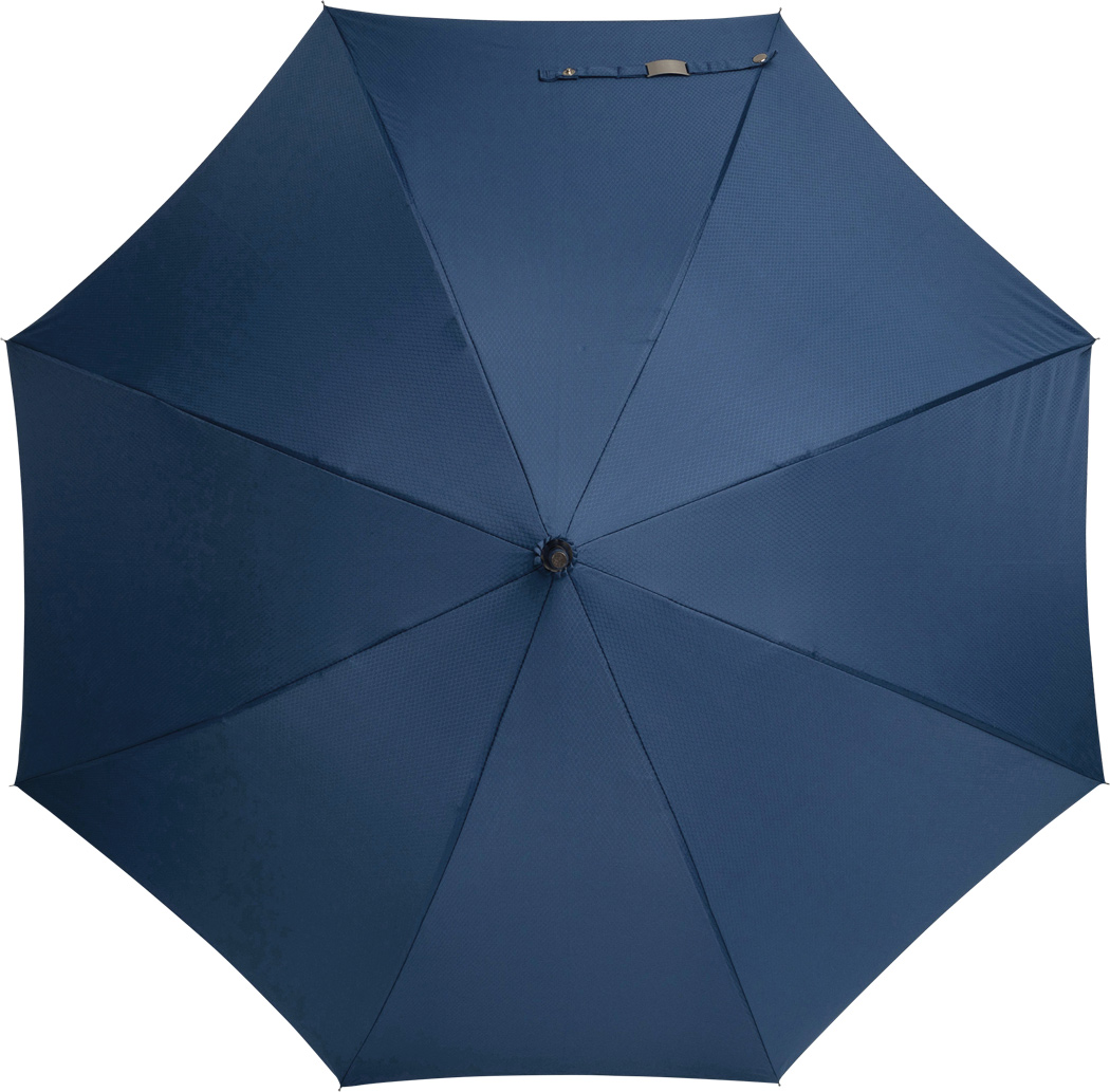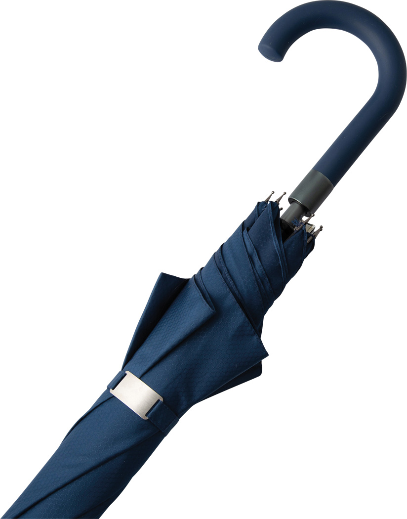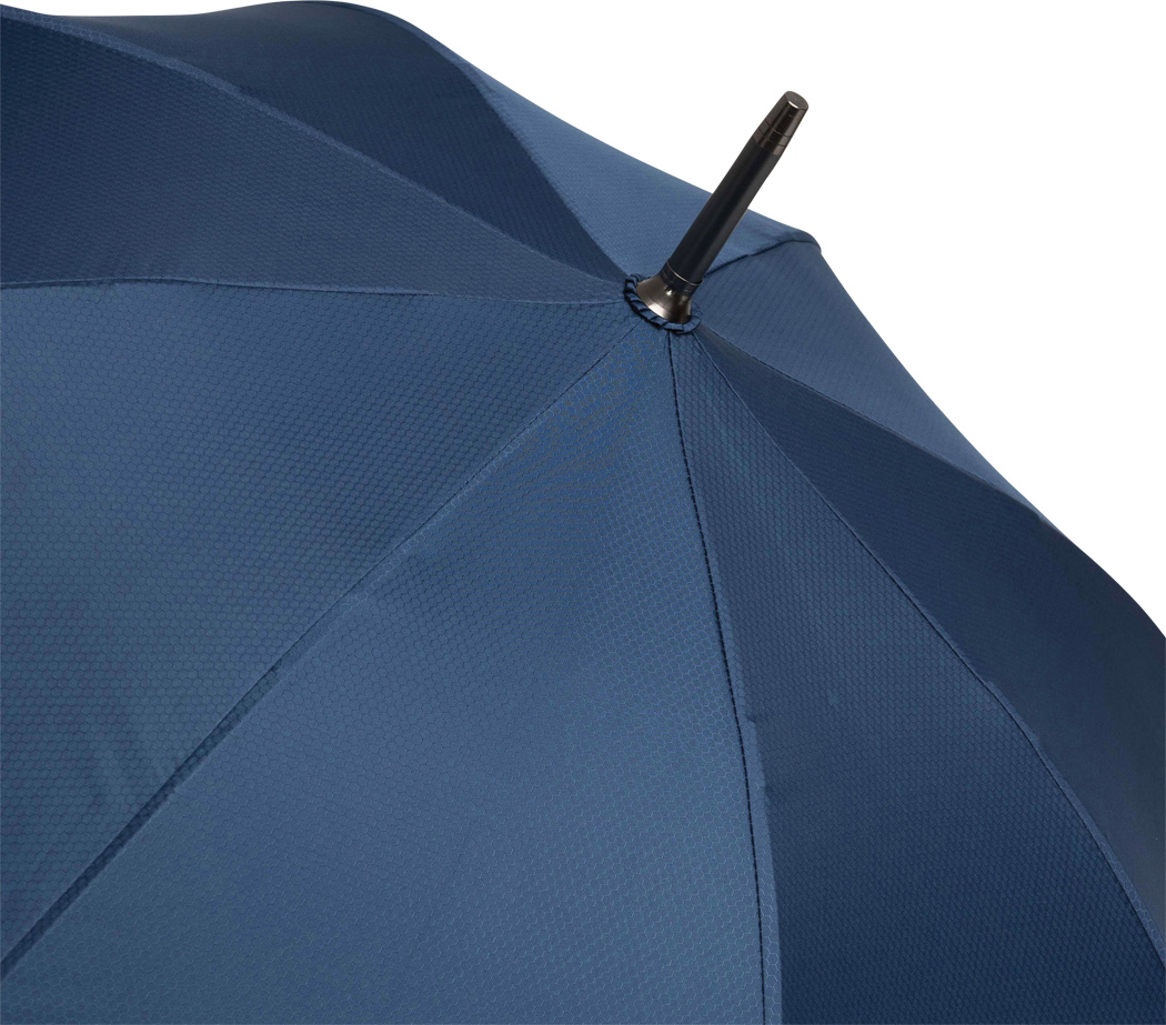 Automatischer Windproof-Stockschirm JUBILEE: Aluminiumstock, Fiberglasspeichen, Metalltips, gummierter und farblich abgestimmter Rundhakengriff, Polyester-Bespannung und -Hülle mit Wabenstruktur, Verschlussband mit Druckknopf und Metall-Platte zur Werbeanbringung