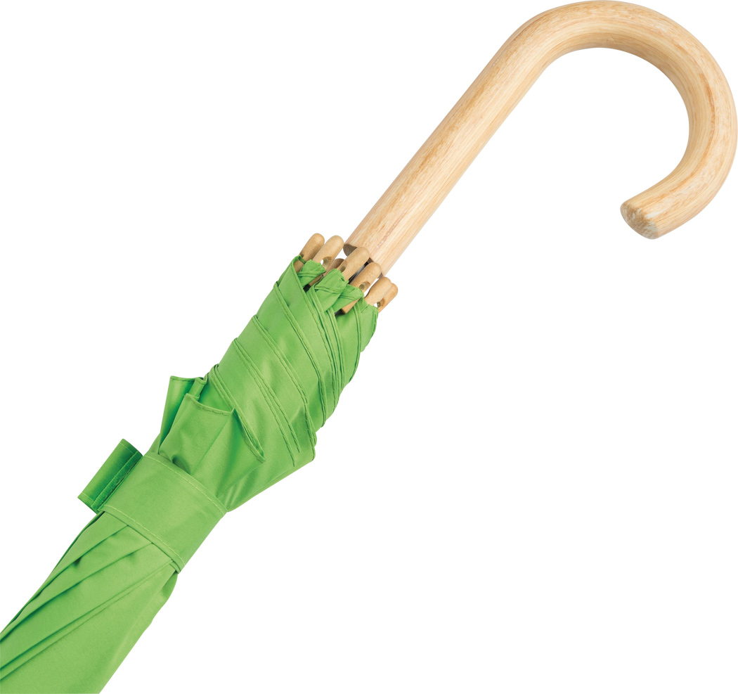 Automatik-Stockschirm LIPSI: Metallstock, Fiberglasspeichen, Holztips und -Rundhakengriff, Polyester-Pongee-Bespannung aus recycelten Kunststoffen / RPET, Schließband mit Klettverschluss