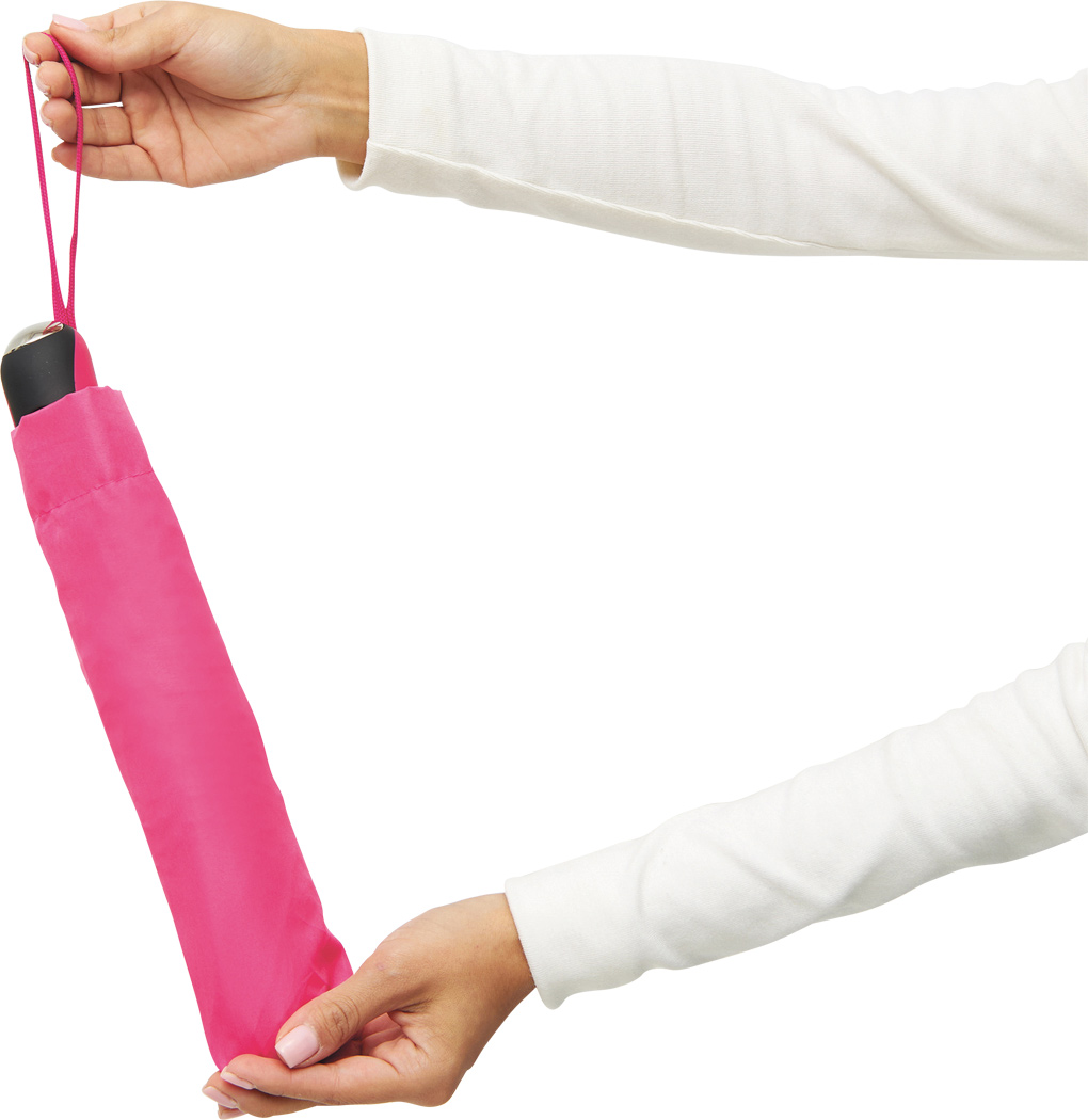 Automatik-Taschenschirm COVER: 3-teiliger Metallstock, Metallspeichen und -tips, gummierter Griff, Polyester-Pongee-Bespannung und -Hülle, Schließband mit Klettverschluss