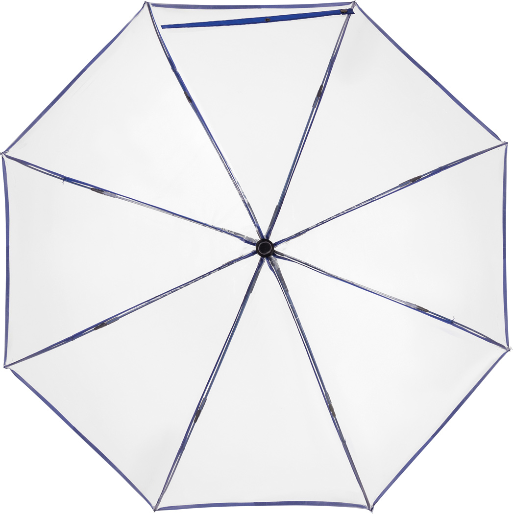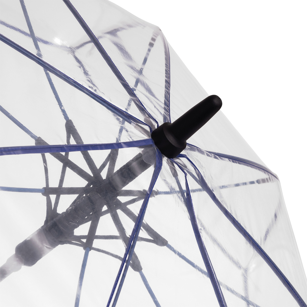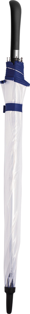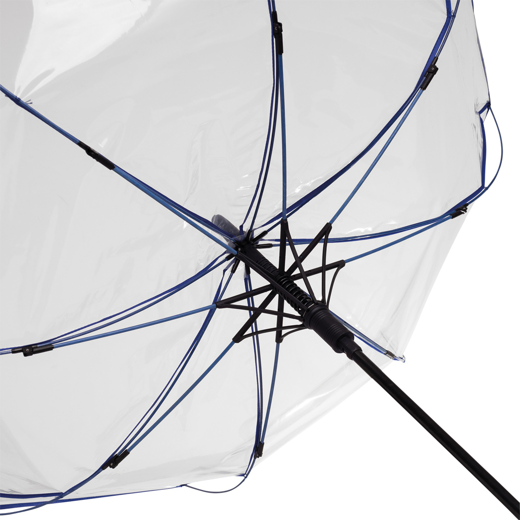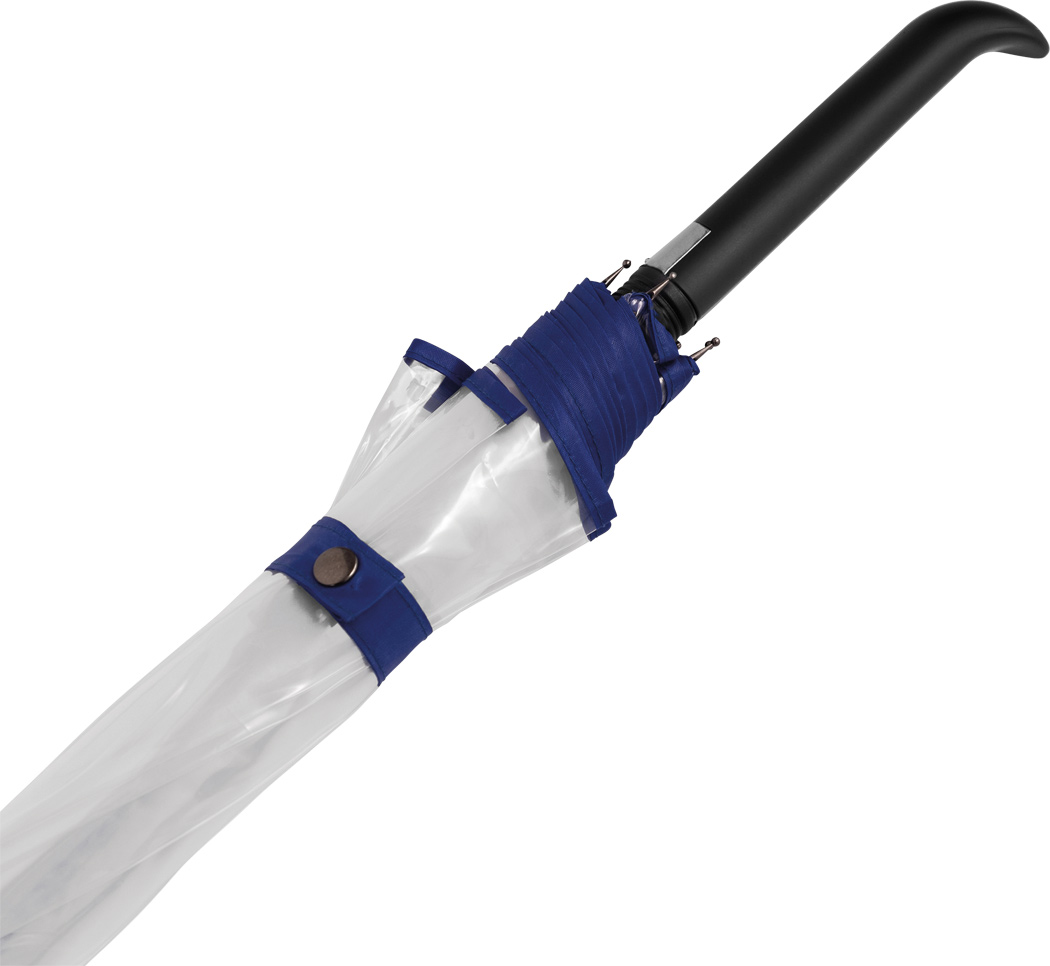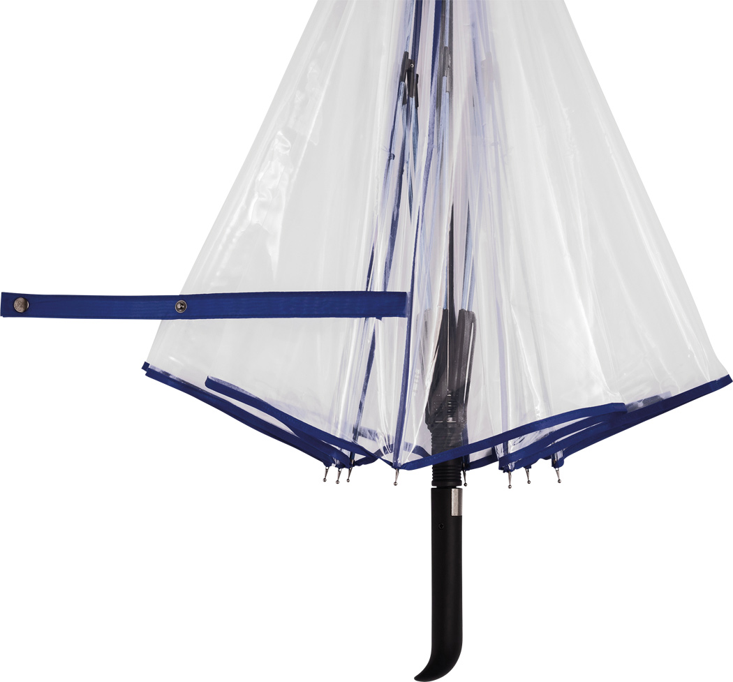 Automatischer Windproof-Stockschirm VIP: Metallstock, farbige Fiberglasspeichen mit Metalltips, Kunststoffspitze, Kunststoffgriff mit integrierter Auslösetaste, transparente POE-Bespannung mit farbiger Paspelierung, Schließband mit Druckknopf