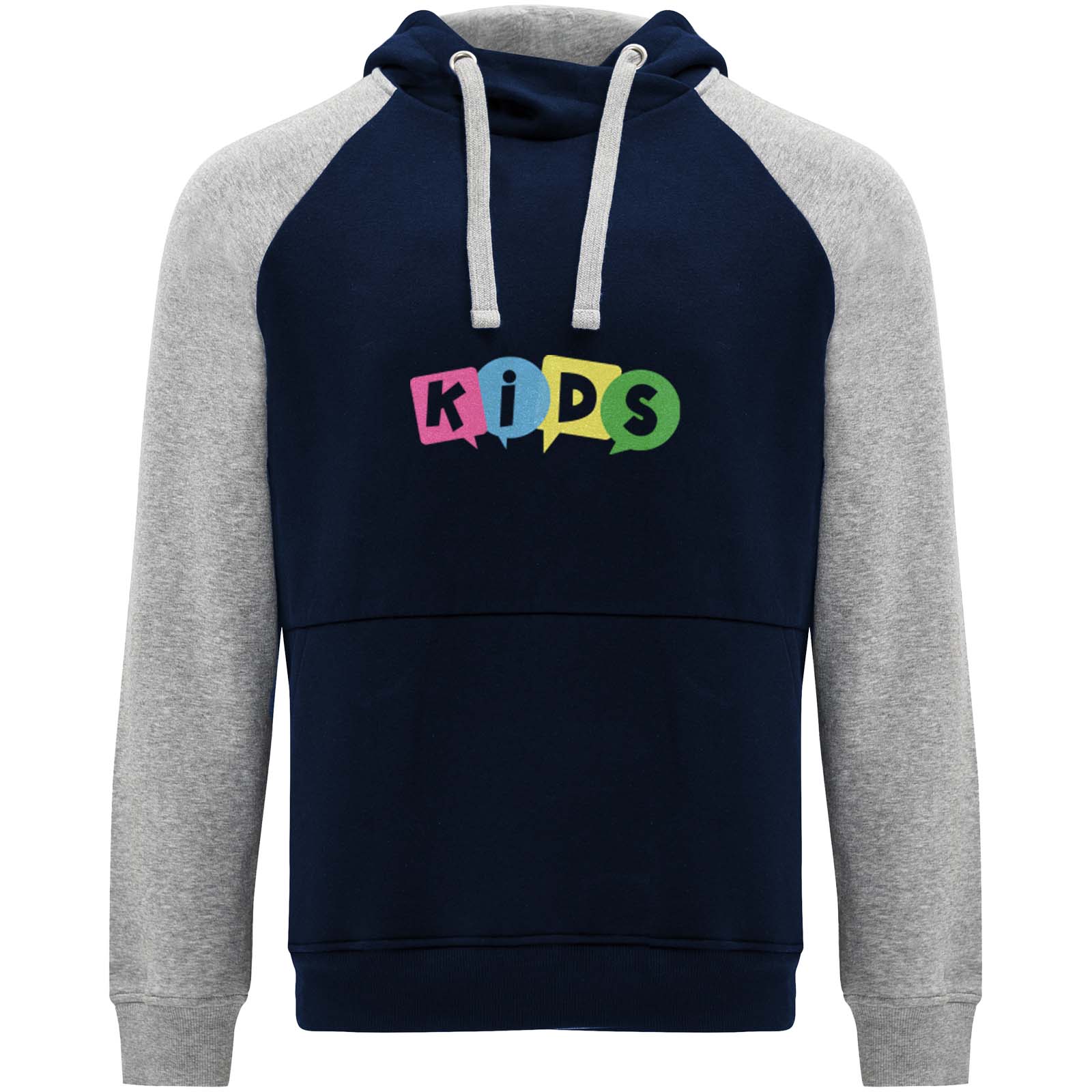 Badet zweifarbiger Kapuzenpullover für Kinder bedruckt mit Logo und kurzfristig lieferbar.