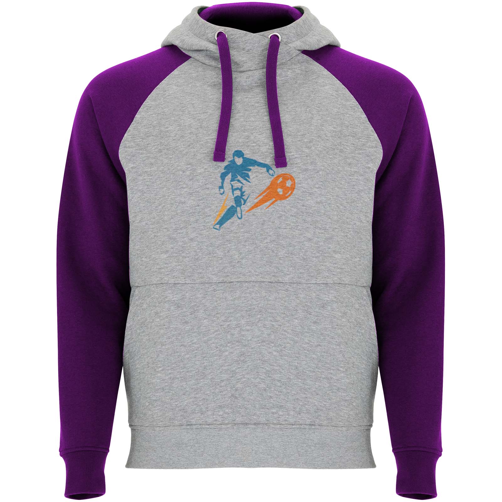 Zweifarbiger Unisex Kapuzenpulli. Kapuze mit gekreuztem Kragen und Metallösen. Innenkapuze, Kordelzug und Raglanärmel in Kontrastfarbe. Kängurutasche. Bündchen und Saum aus elastischem 1×1-Rippstrick. Abnehmbares Etikett.