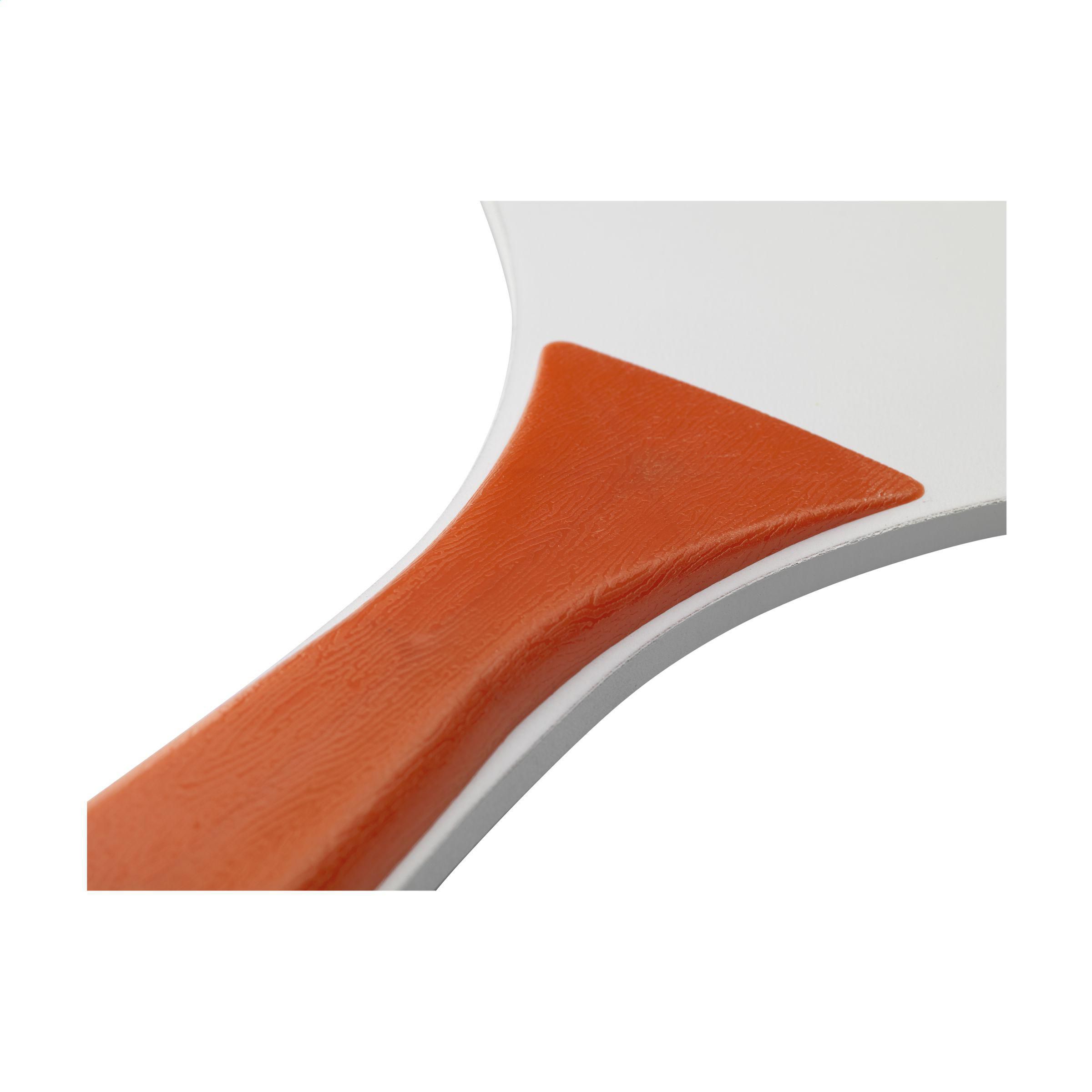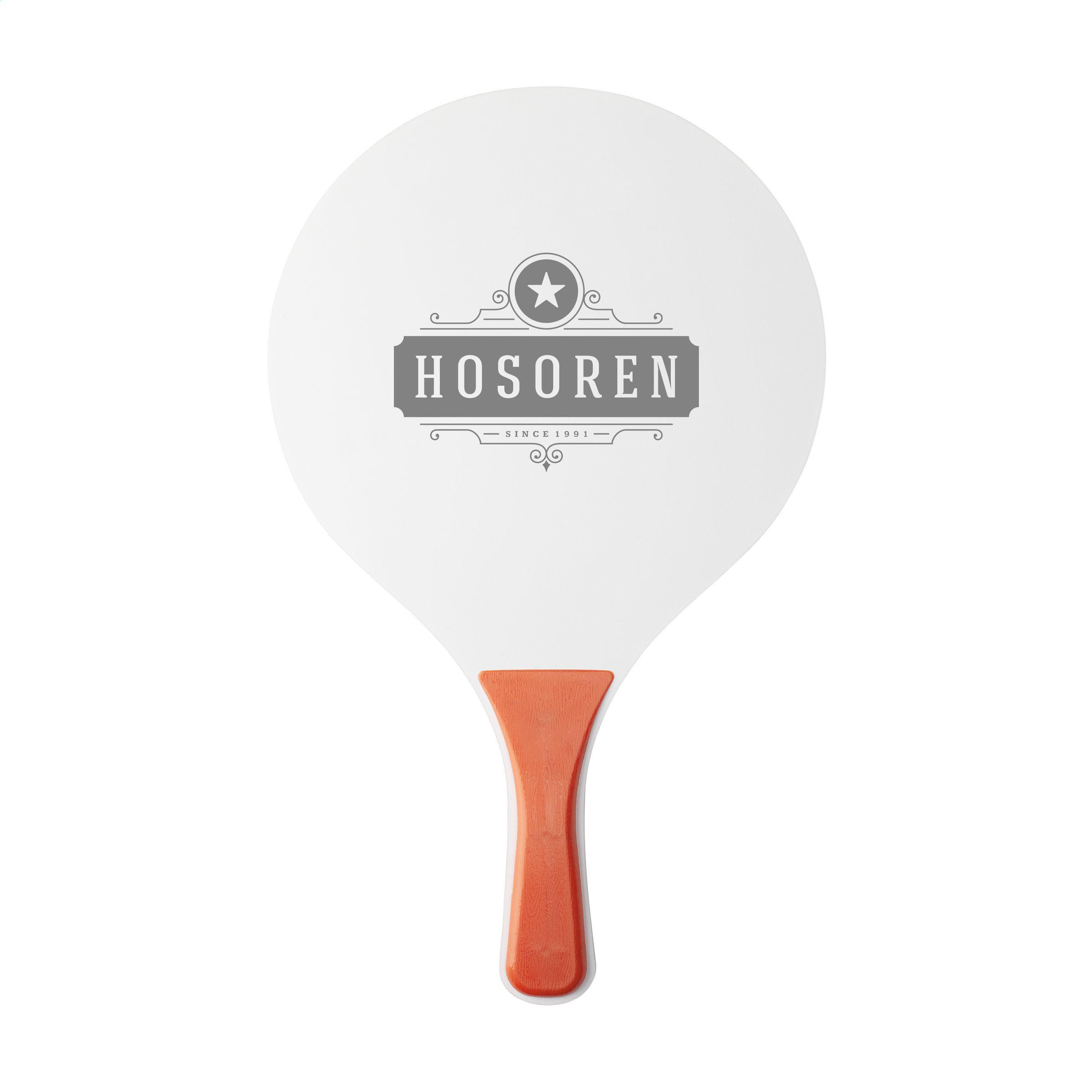 Sportliches Strandset: 2 Schläger aus MDF-Holz mit PP-Kunststoffgriffen und Gummiball. Pro Set in einem Netz zur Aufbewahrung.ACHTUNG: Bei einem 2-Farbendruck auf den Schlägern ist keine perfekte Passgenauigkeit möglich - dies ist nur gewährleistet, wenn sich die Farben nicht berühren.