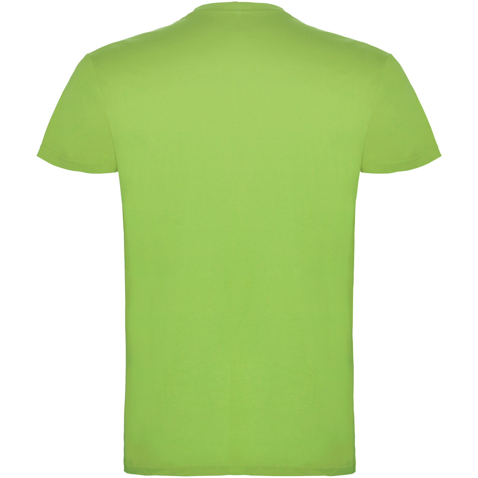 Kurzärmeliges T-Shirt mit doppellagigem Rundhalsausschnitt aus Elasthan, hergestellt aus schlauchförmigem Material für Erwachsene. Verstärkte und verdeckte Nähte am Kragen. Herausnehmbares Etikett. Das Modell ist 190 cm groß und trägt Größe L.