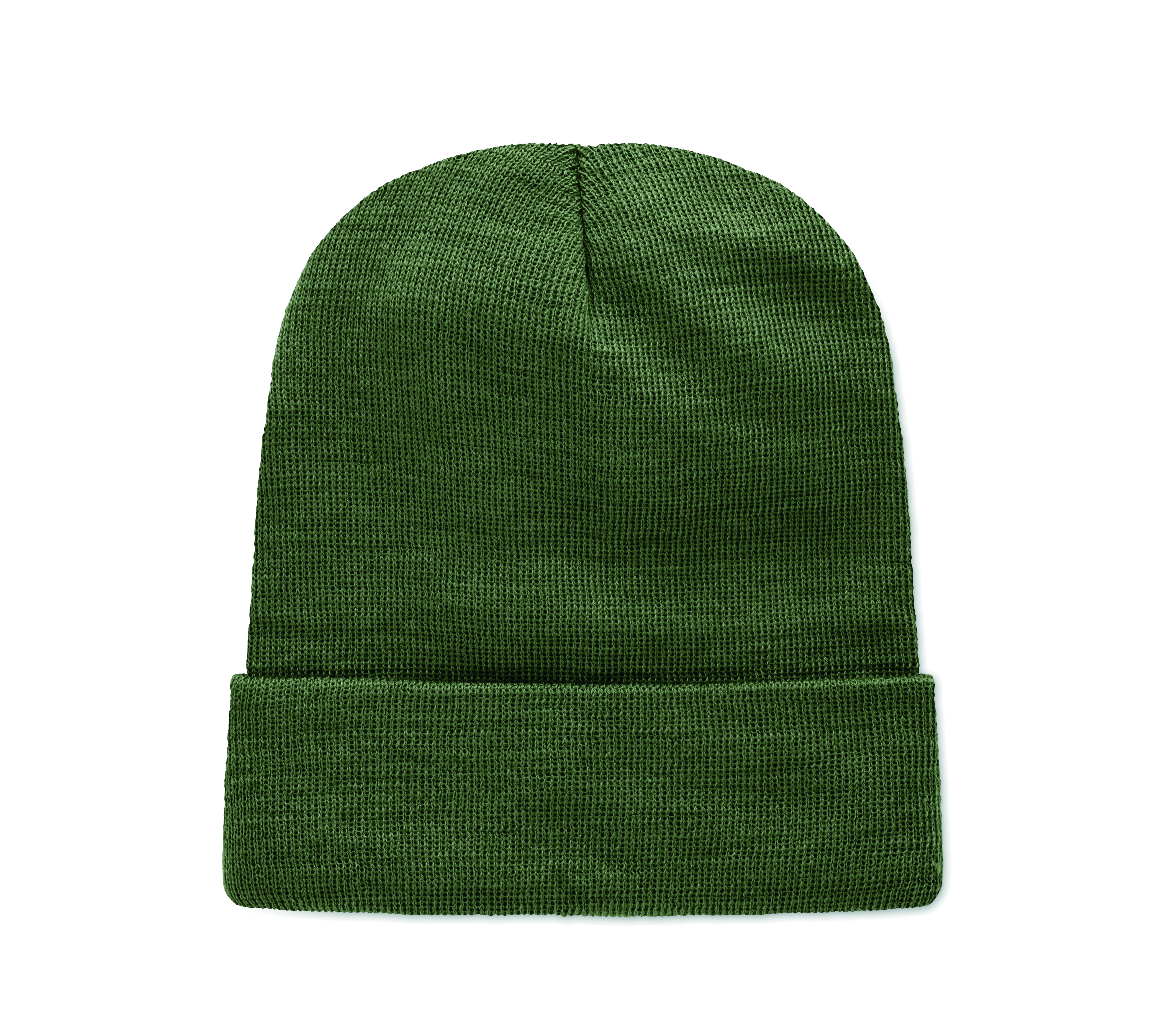 Beanie aus softem, elastischem RPET-Polyester. Mit Umschlag und Aufnäher. Unisex.