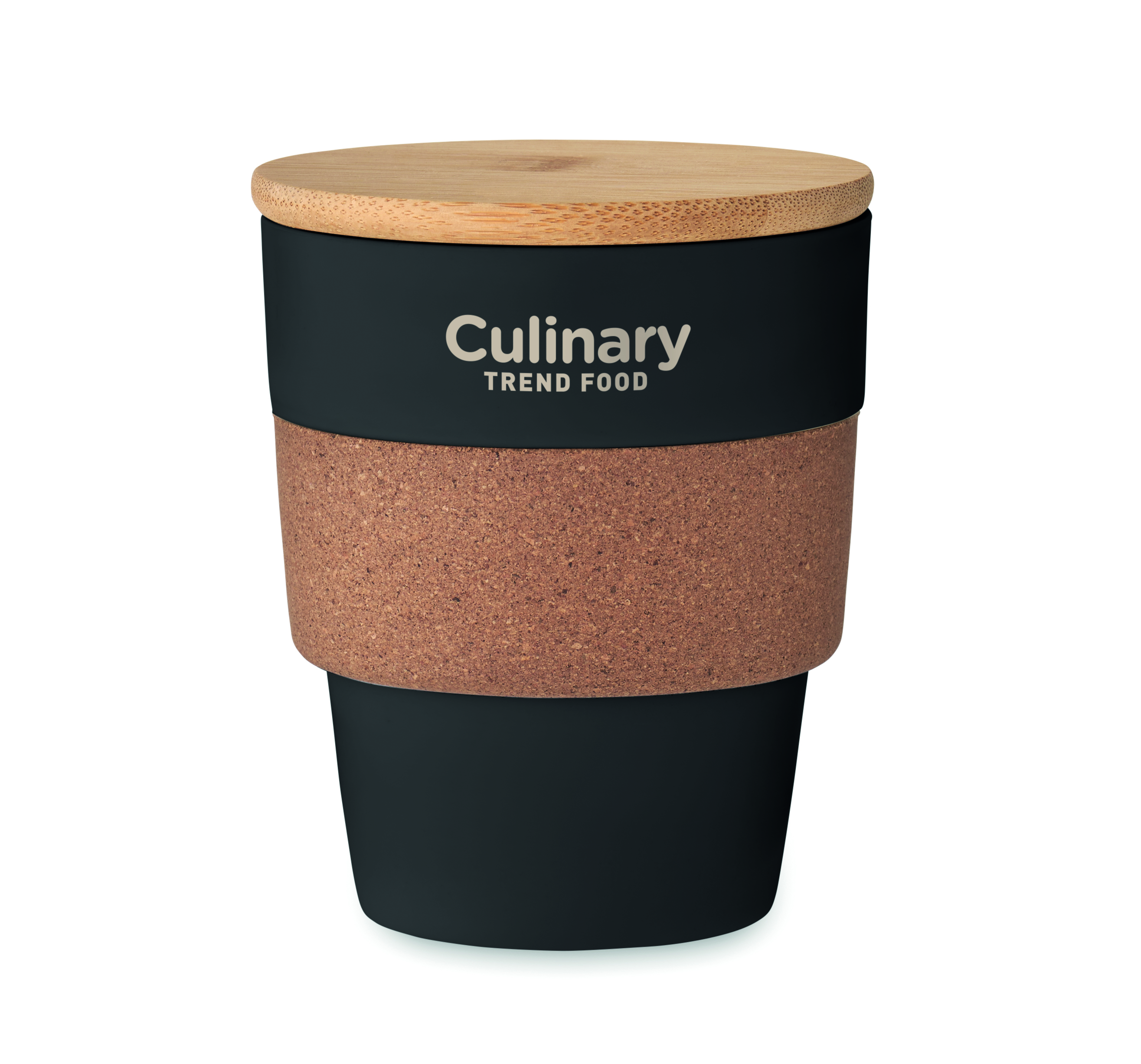 Einwandiger Trinkbecher aus PP. Griff aus Kork und Deckel aus Bambus. Füllmenge: 300 ml. Da es sich um einen einwandigen Becher handelt, kann es trotzdem zu einer Wärmeübertragung kommen. Bambus ist ein natürliches Produkt, es kann daher zu leichten Abweichungen in Farbe, Dekor und Maßen kommen.