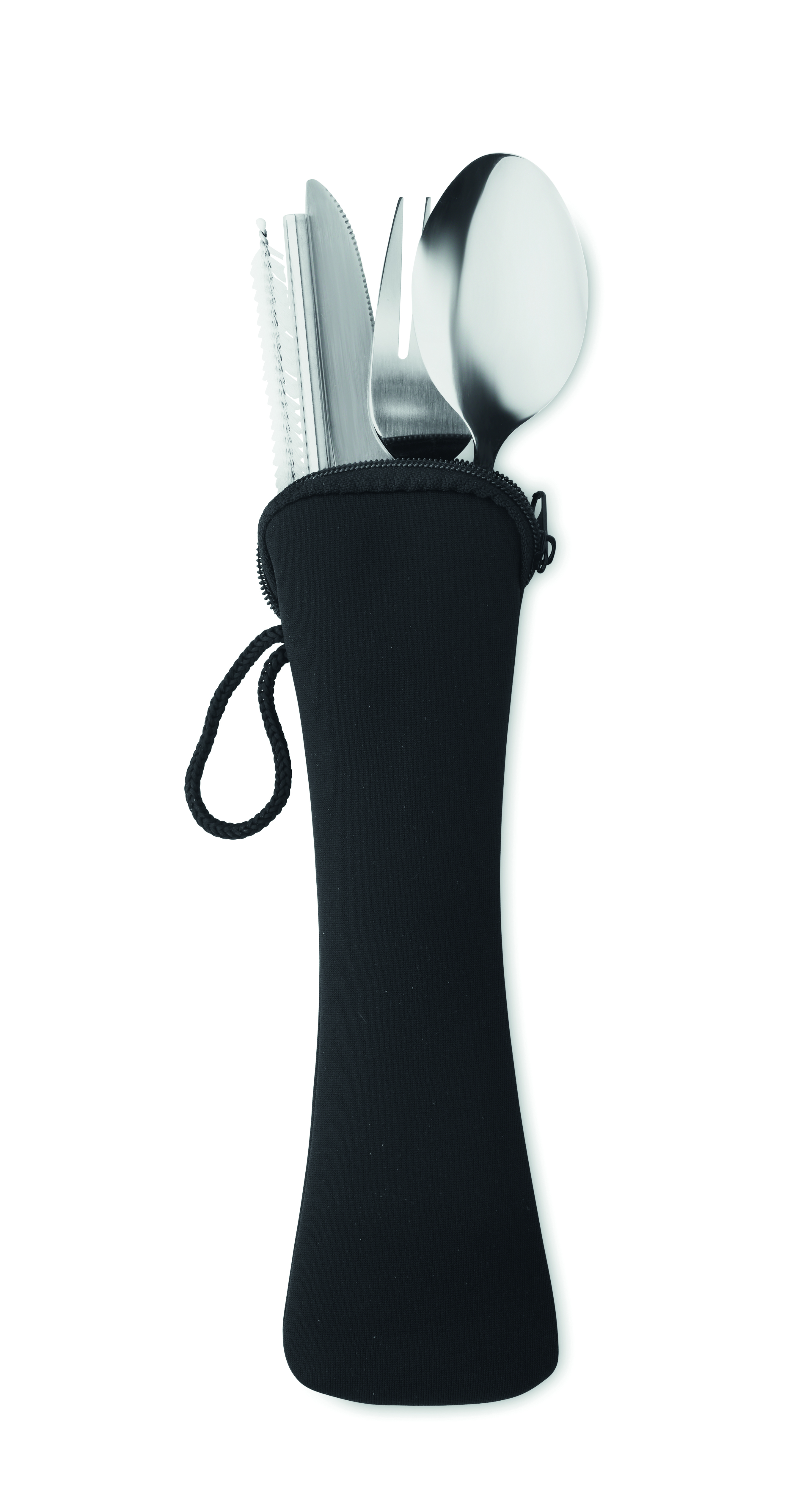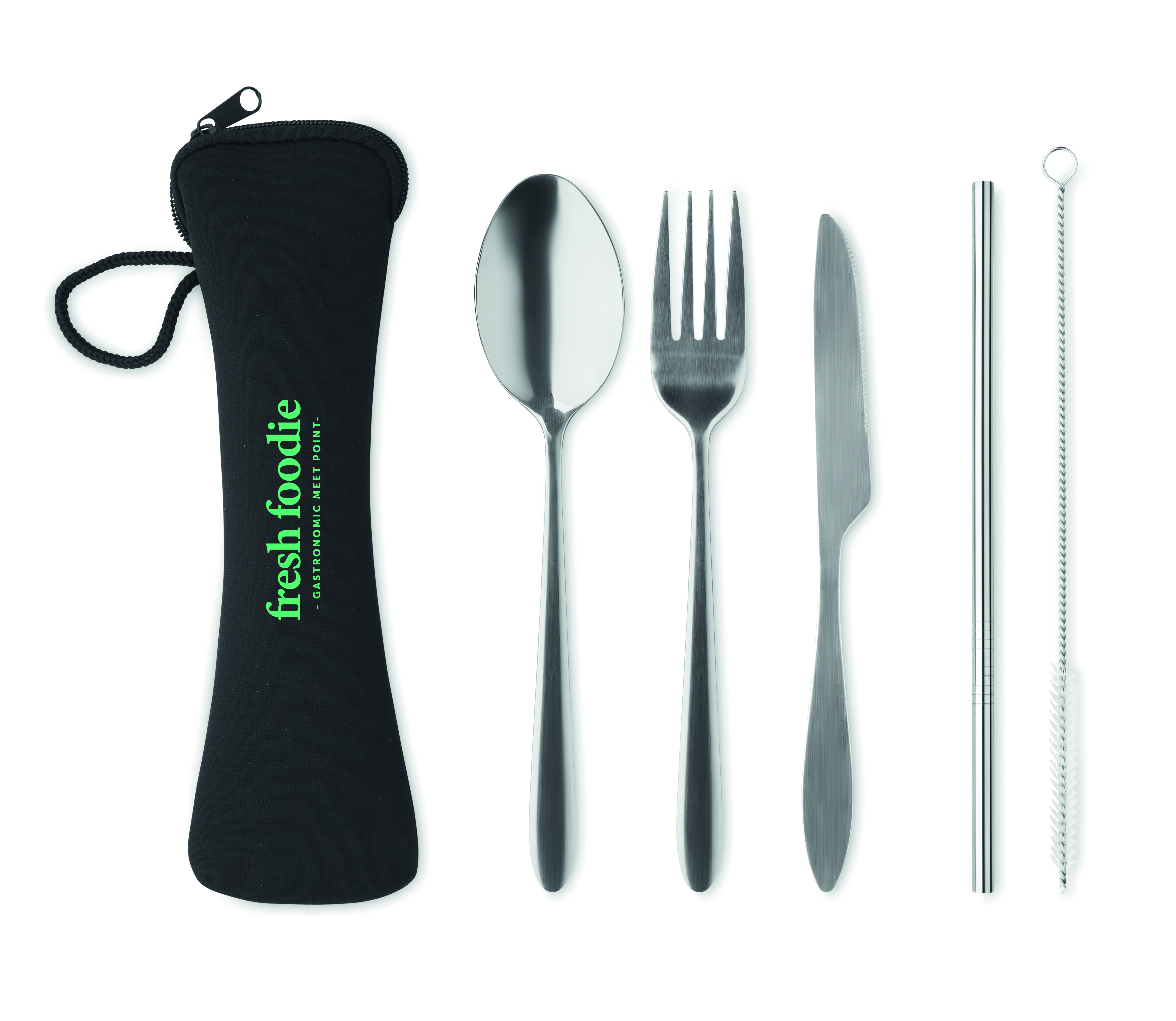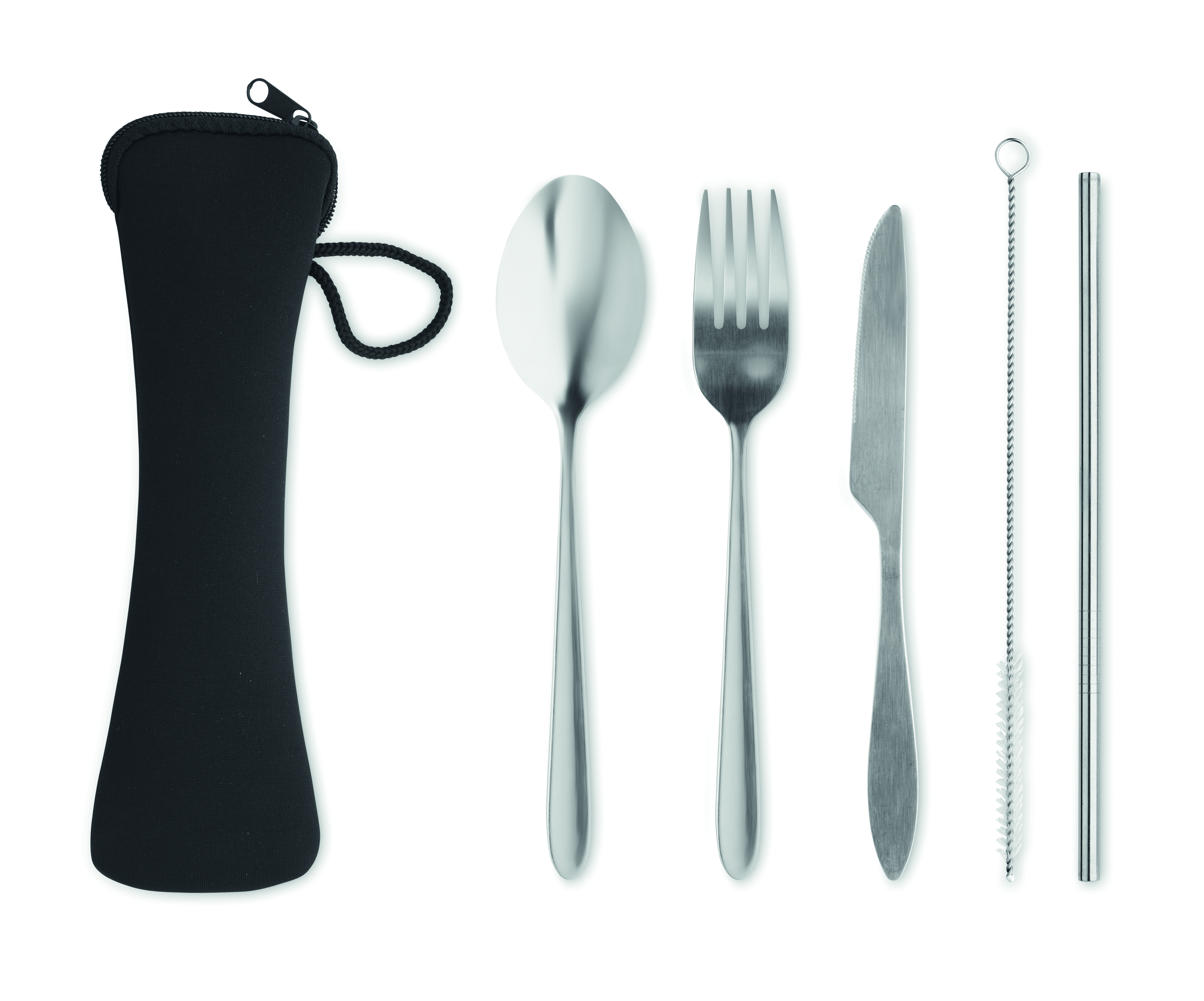 Wiederverwendbares Besteck-Set mit Messer, Gabel, Löffel, Trinkhalm und Bürste aus Edelstahl im EVA-Beutel.