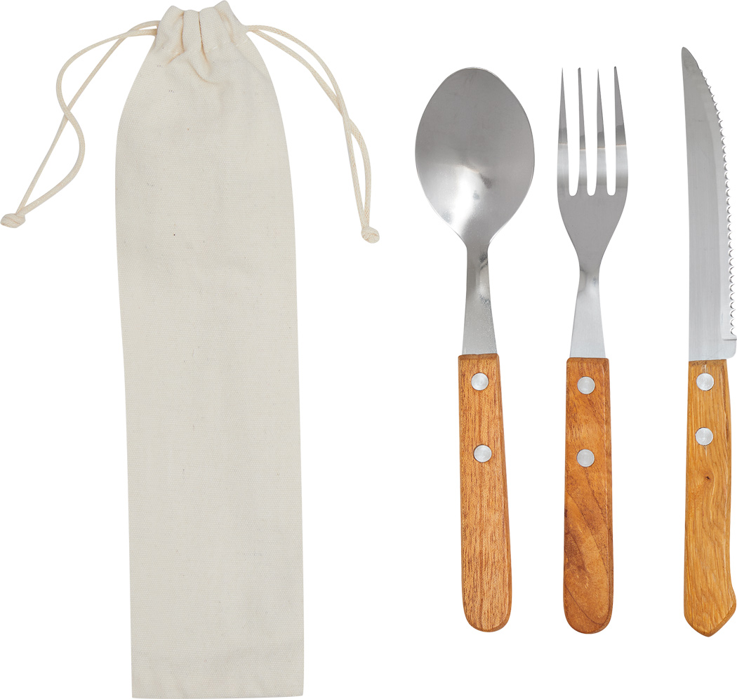 Besteckset ECO TRIP, im Baumwoll-Säckchen: inkl. Gabel, Messer und Löffel aus Edelstahl mit Holzgriff