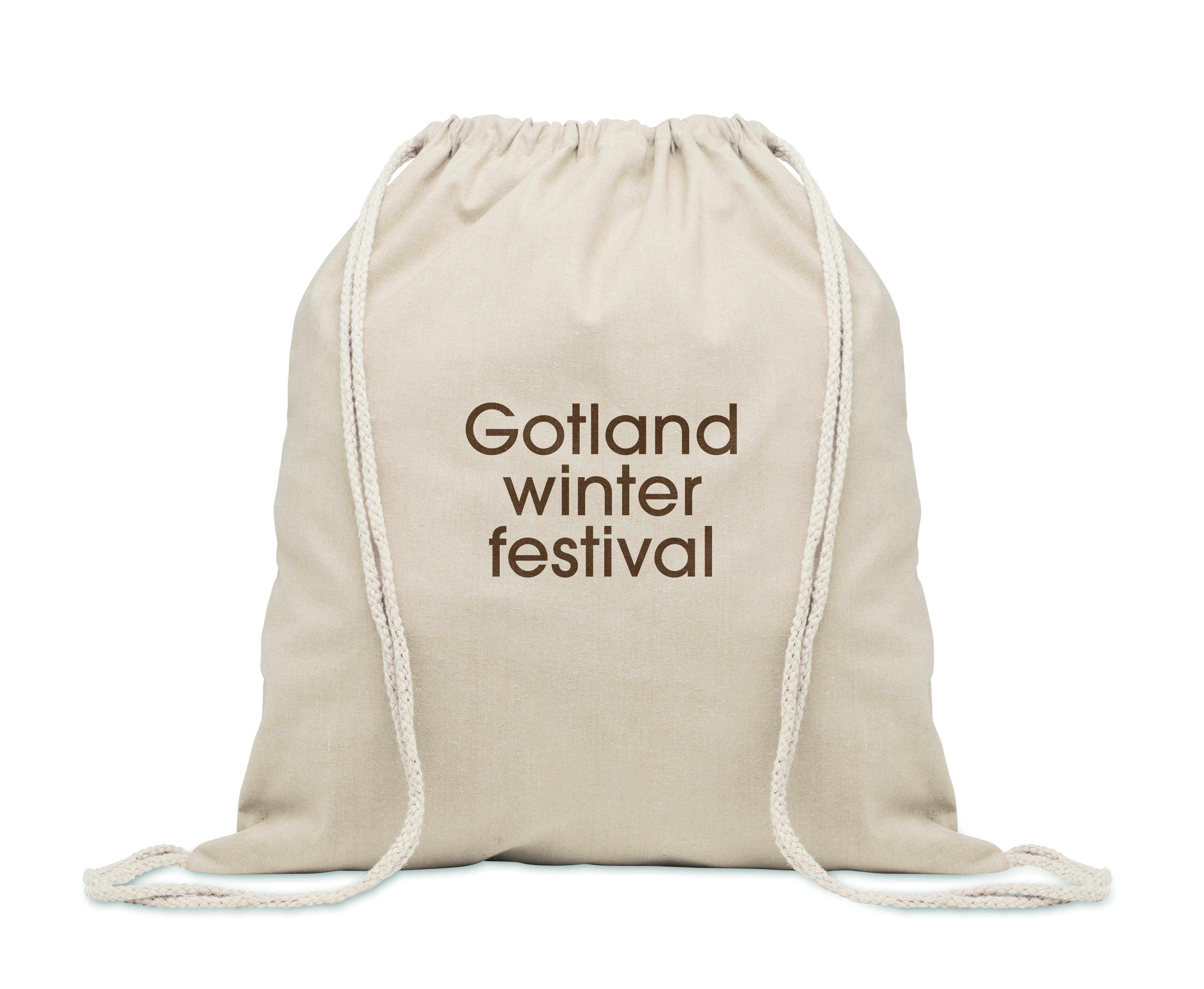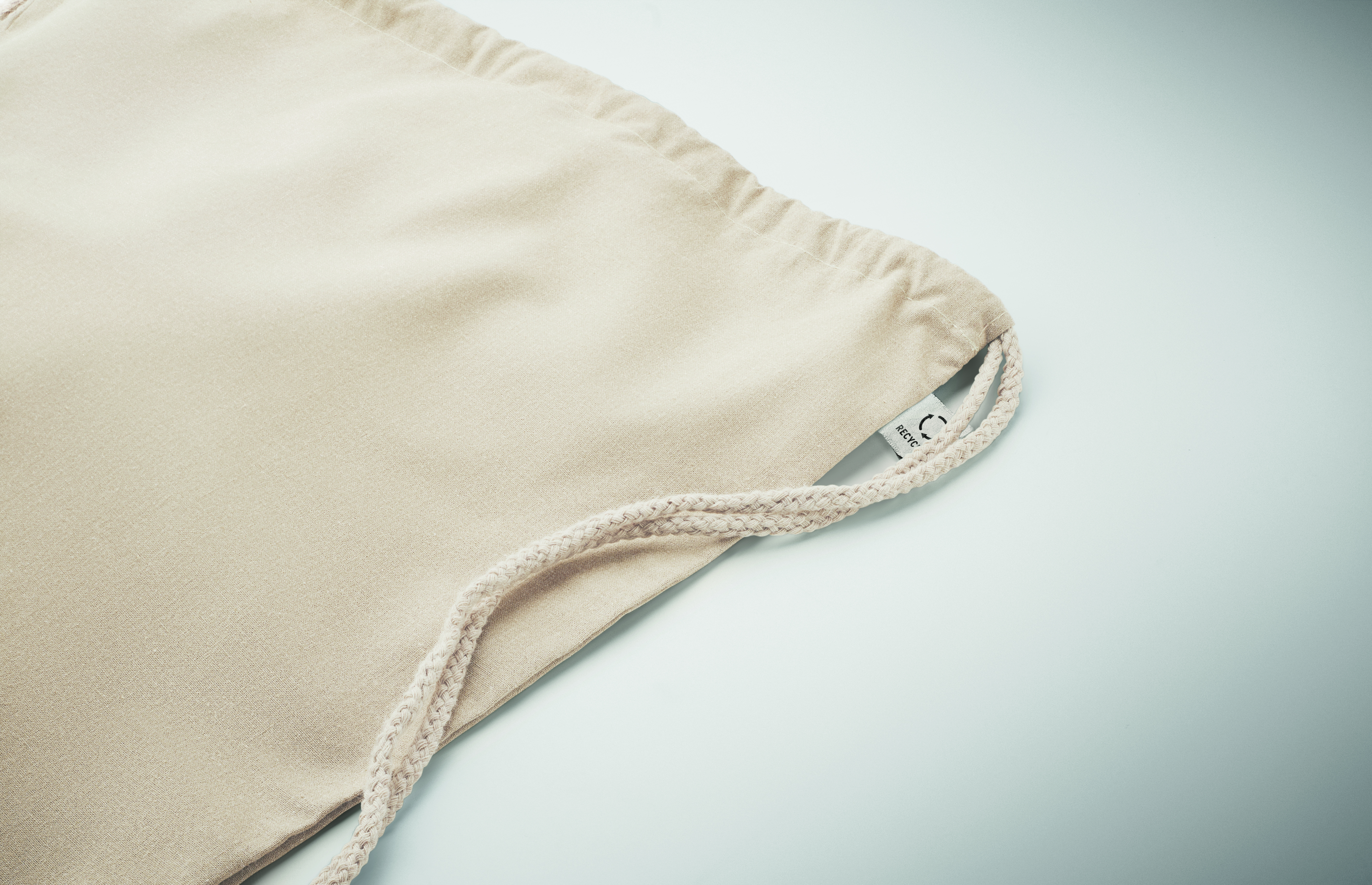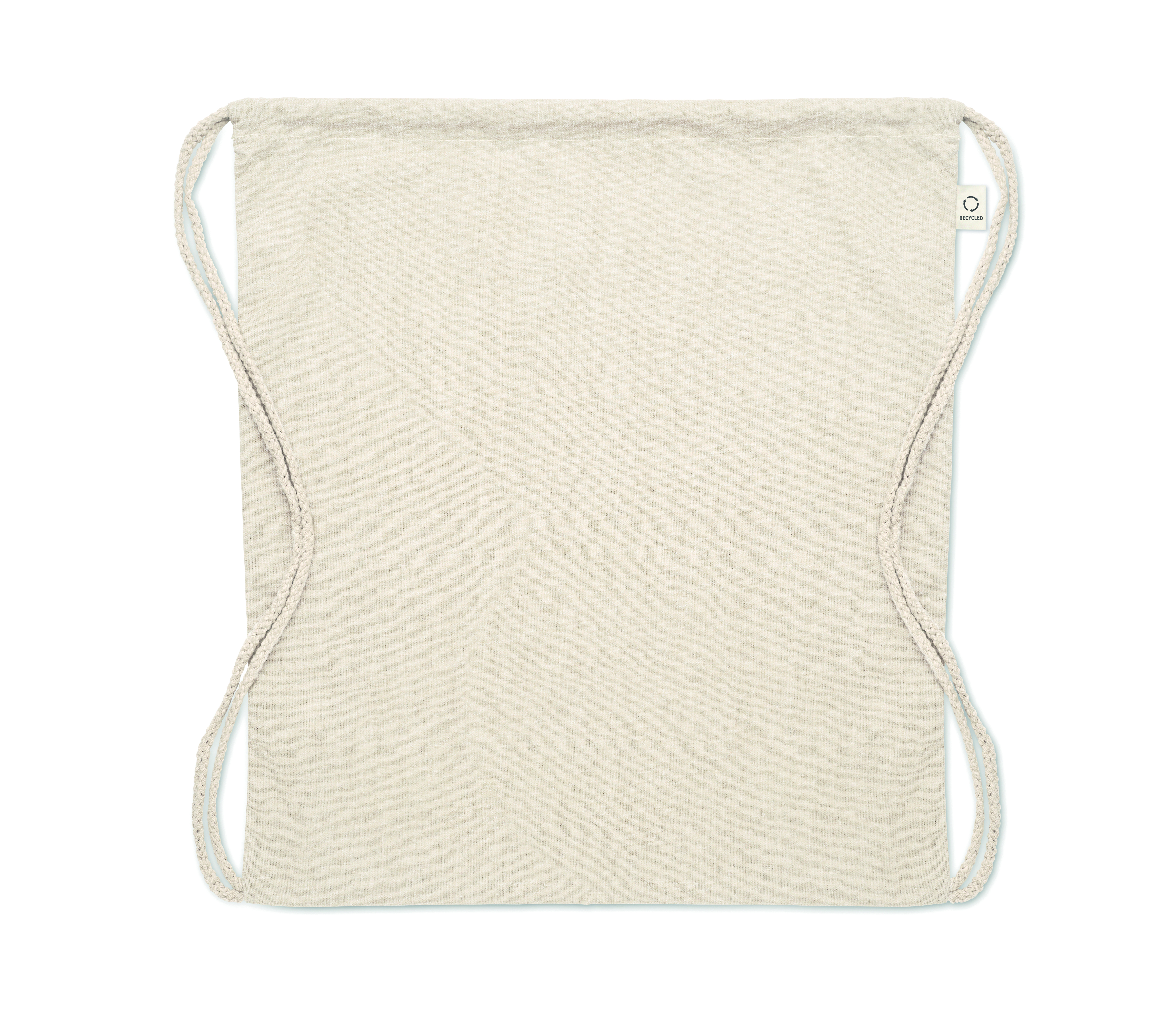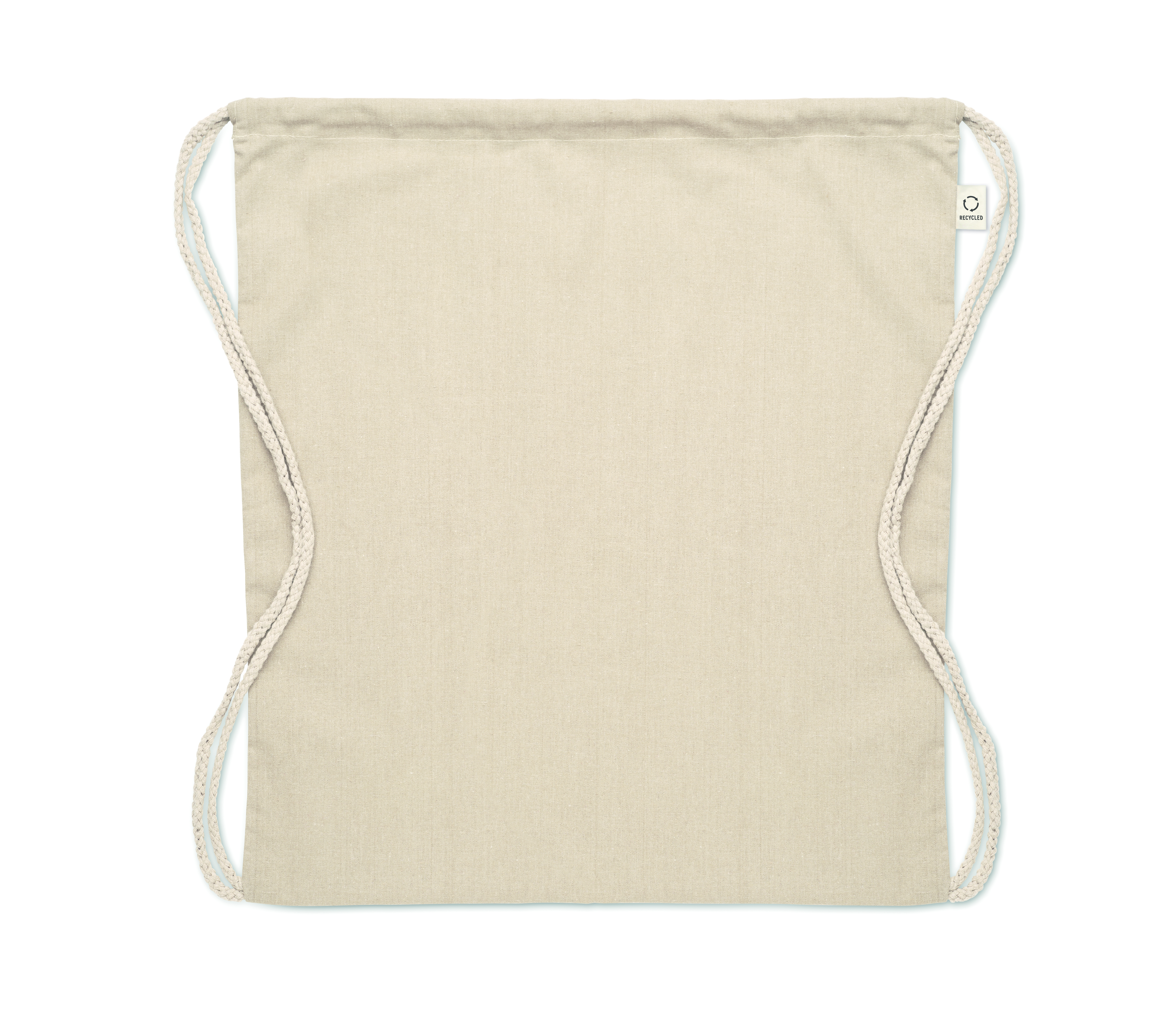Beutel mit Kordelzug aus recycelter Pre-Consumer-Baumwolle (70 %) und RPET (30 %). 140 g / m². Artikel kann nach dem Bedrucken schrumpfen.
