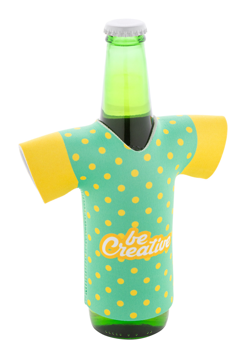 Individueller RPET-Neopren-Bierflaschenkühler in T-Shirt-Form. Mit vollflächigem Sublimationsdruck. Mindestmenge: 50 Stk.