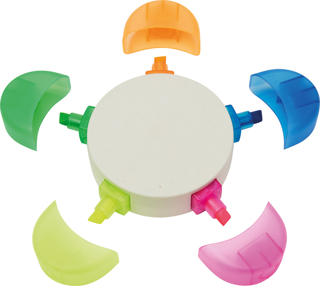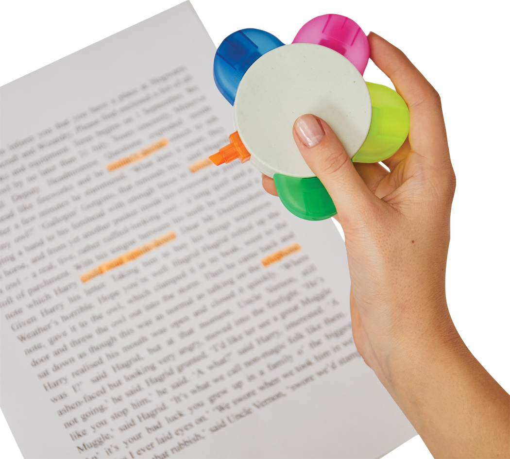 Blumenförmiger Textmarker FLOWER: mit 5 Farben (grün, orange, blau, pink, gelb), zu 30% aus recycelten Milchkartons