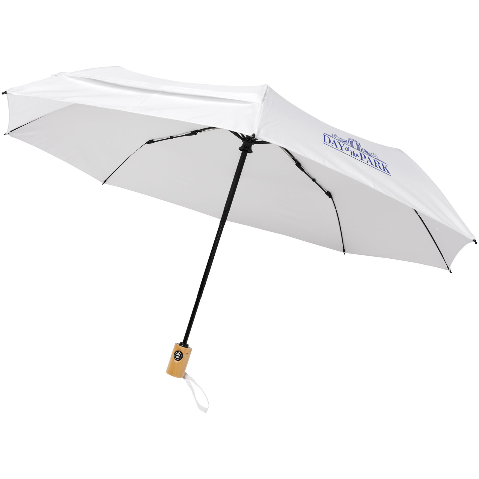 Vollautomatik Kompaktregenschirm mit Schirm aus recyceltem PET-Pongee-Polyester. Robuster Metallschaft und hochwertiger Rahmen mit Glasfaserrippen, der maximale Flexibilität bei windigem Wetter bietet. Wird mit einer Tasche geliefert und passt zum bequemen Transport gut in eine Handtasche oder einen Rucksack. Zusammen mit dem Holzgriff und dem recycelten PET-Pongee-Polyesterschirm bietet er eine nachhaltigere Wahl. Erhältlich in vielen verschiedenen modernen Farben mit einer großen Werbeanbringungsfläche auf jedem Paneel.