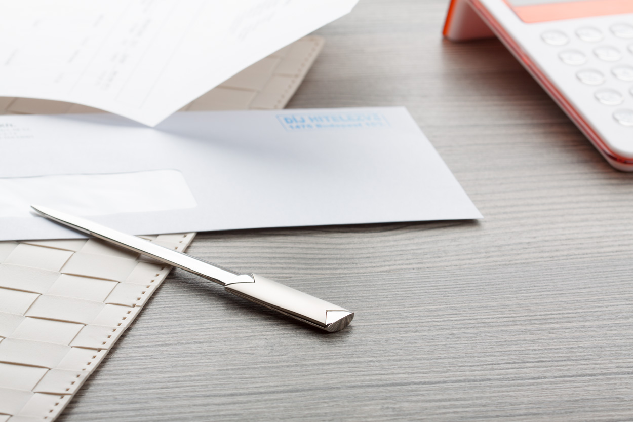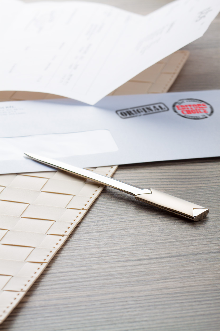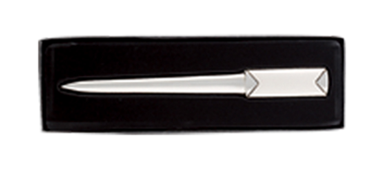 Verchromter Brieföffner aus Metall in einer schwarzen Geschenkbox.