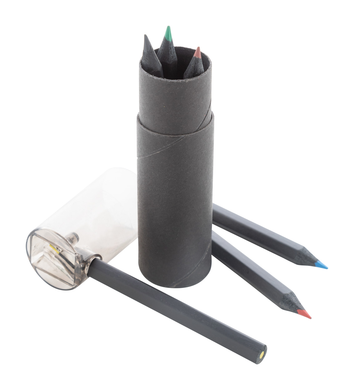 6-teiliges Buntstifteset aus schwarzem Holz in einem runden Etui aus schwarzem Karton mit Kunststoffspitzer.