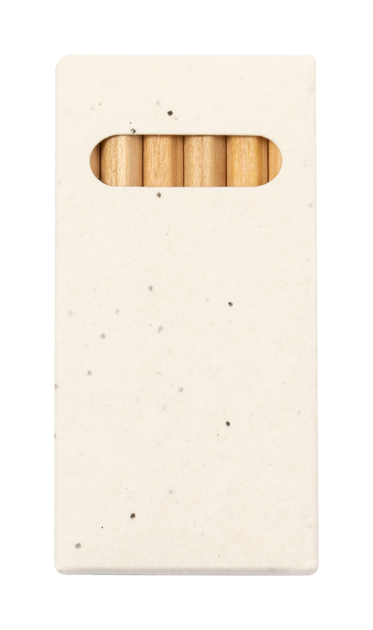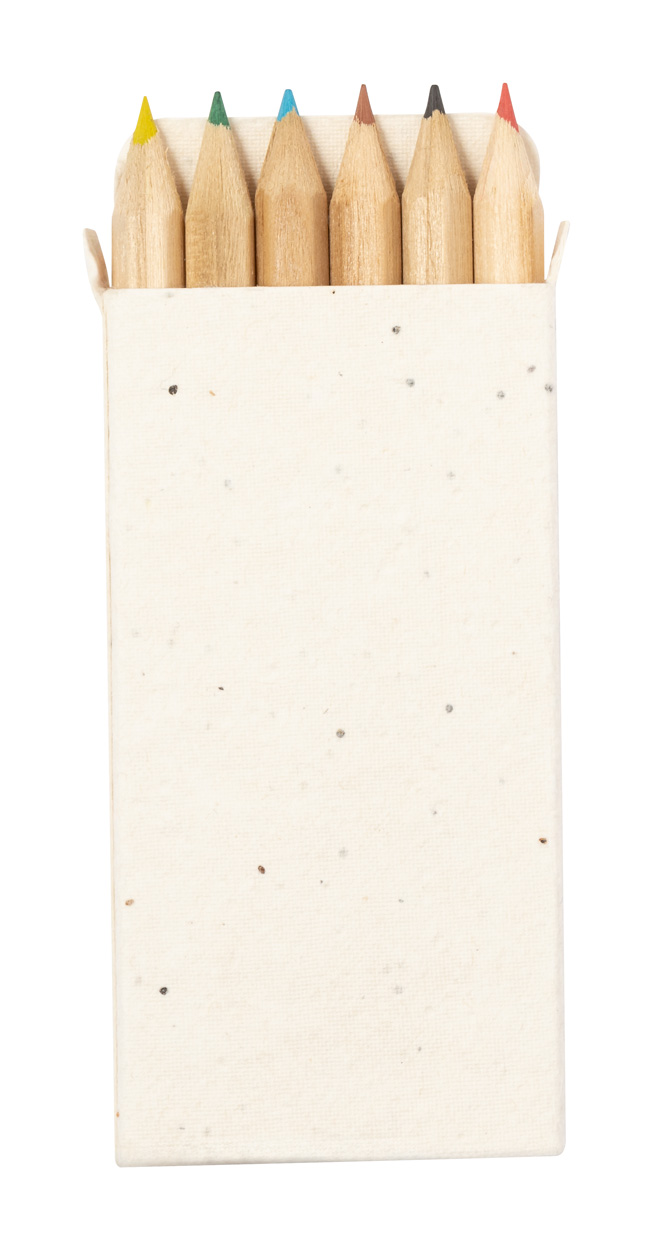 6-teiliges Holz-Buntstifte-Set in einer Samenpapier-Box. In der Samenpapier-Box befinden sich Petuniensamen in verschiedenen Farben, die nach Gebrauch eingepflanzt werden können.