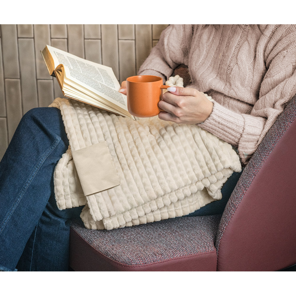 Decke aus recyceltem Polyester (100 % rPET) mit einem Aufnäher zur individuellen Veredelung. Sie fühlt sich weich an und garantiert komfort bei jeder Gelegenheit. 1601 x 1200 mm