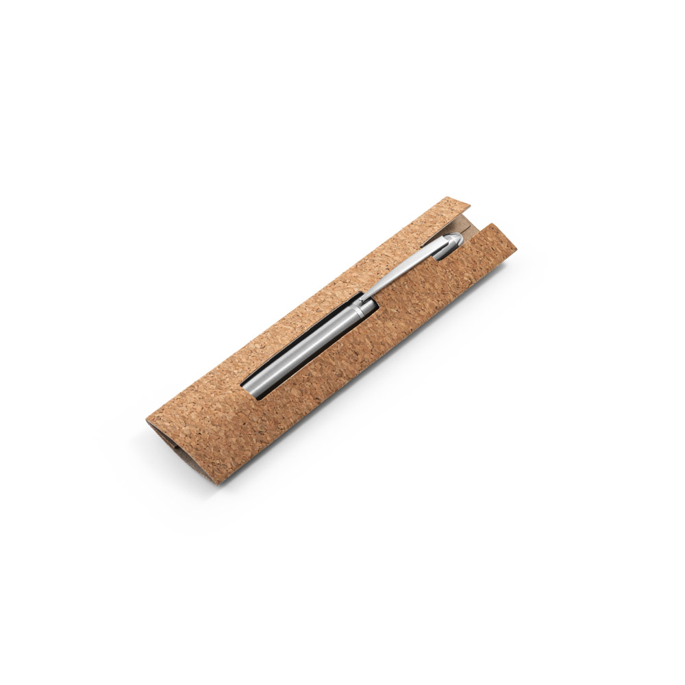 Kugelschreiber mit Gehäuse aus Edelstahl (53% rSS) mit Clip. Der Kugelschreiber hat eine schwarze Schrift und eine Drehmechanik. Geliefert in einem Geschenkbeutel aus Kork. Kugelschreiber: ø11 x 137 mm | Tasche: 155 x 40 mm