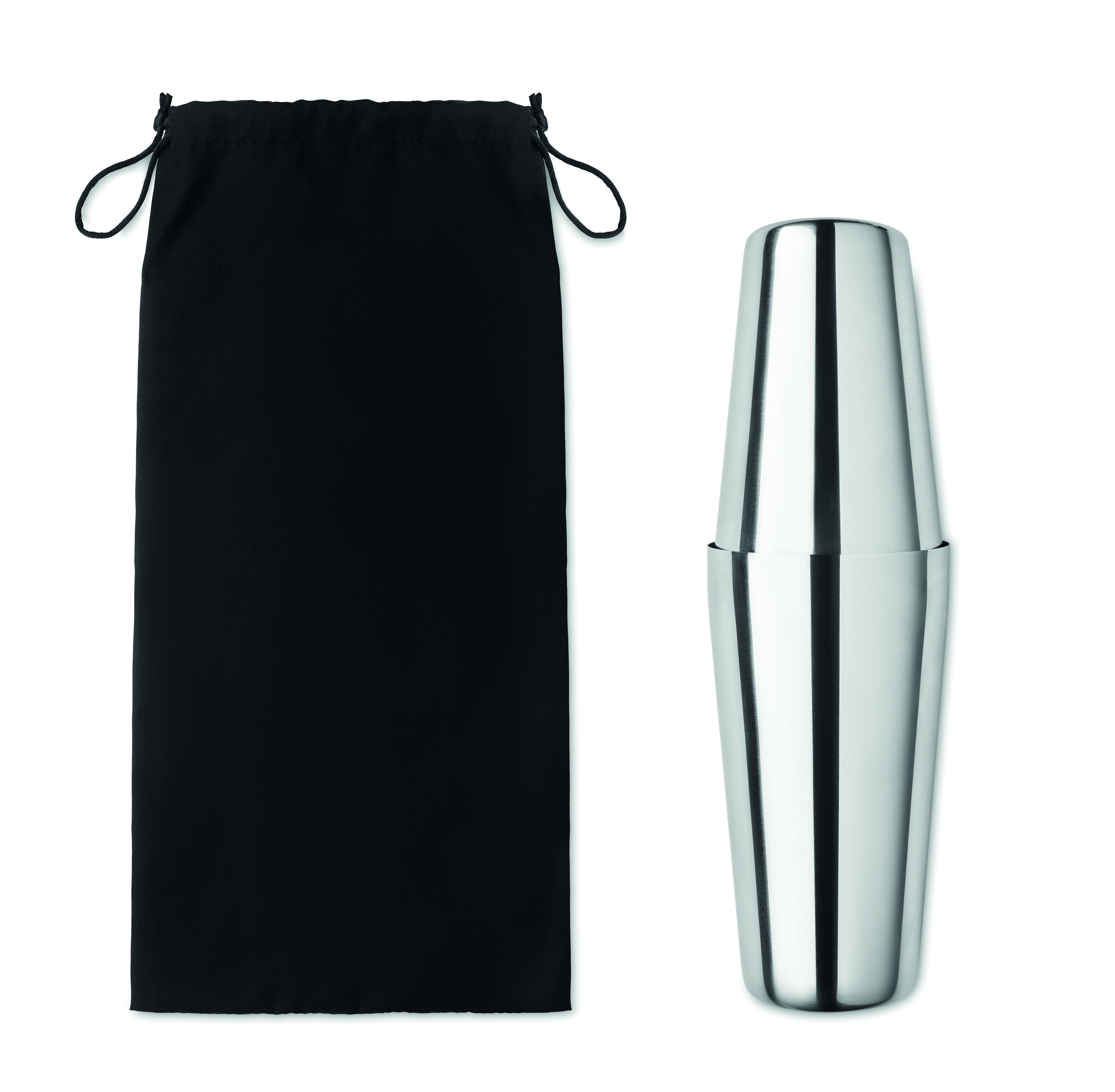 Cocktail-Set aus Edelstahl mit Shaker 750 ml, Messbecher 30 ml und Barsieb. Verpackt in einer Tasche aus Baumwolle.
