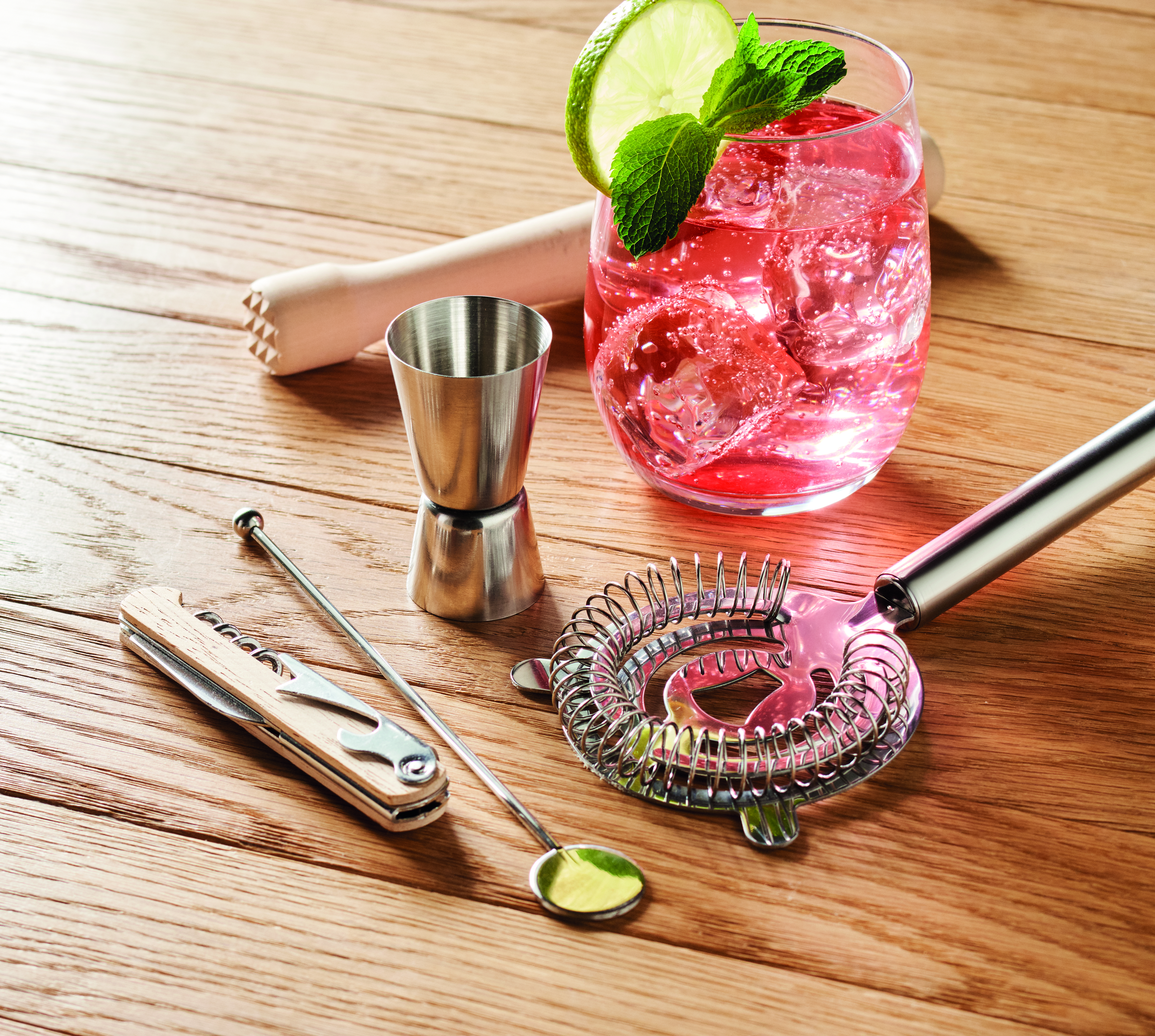 Cocktail-Set im Baumwollbeutel 220g / m² mit Kordelverschluss. Inkl. Messbecher (15 & 30 ml), Stößel aus Holz, Cocktail-Sieb, Barlöffel und Korkenzieher.