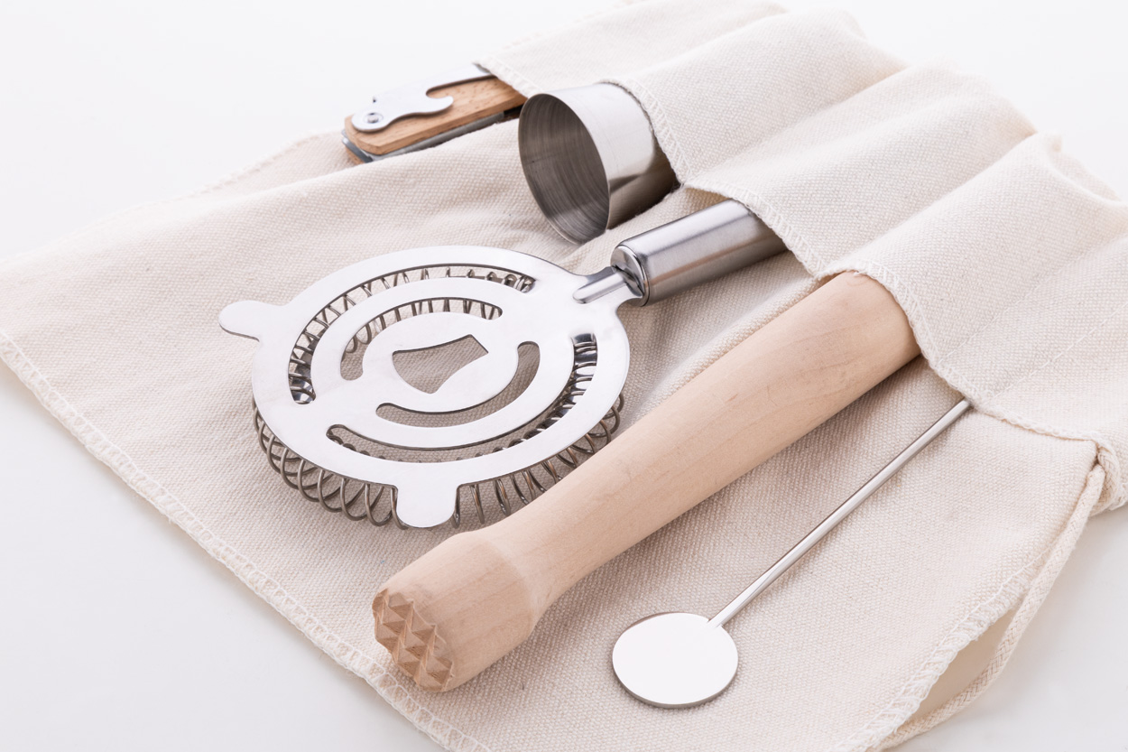 5-teiliges Cocktail-Set im praktischen Baumwoll-Rollbeutel. Inklusive: Messbecher, Barsieb und Barlöffel aus Edelstahl, Korkenzieher mit Holzgriff und Holzstößel.